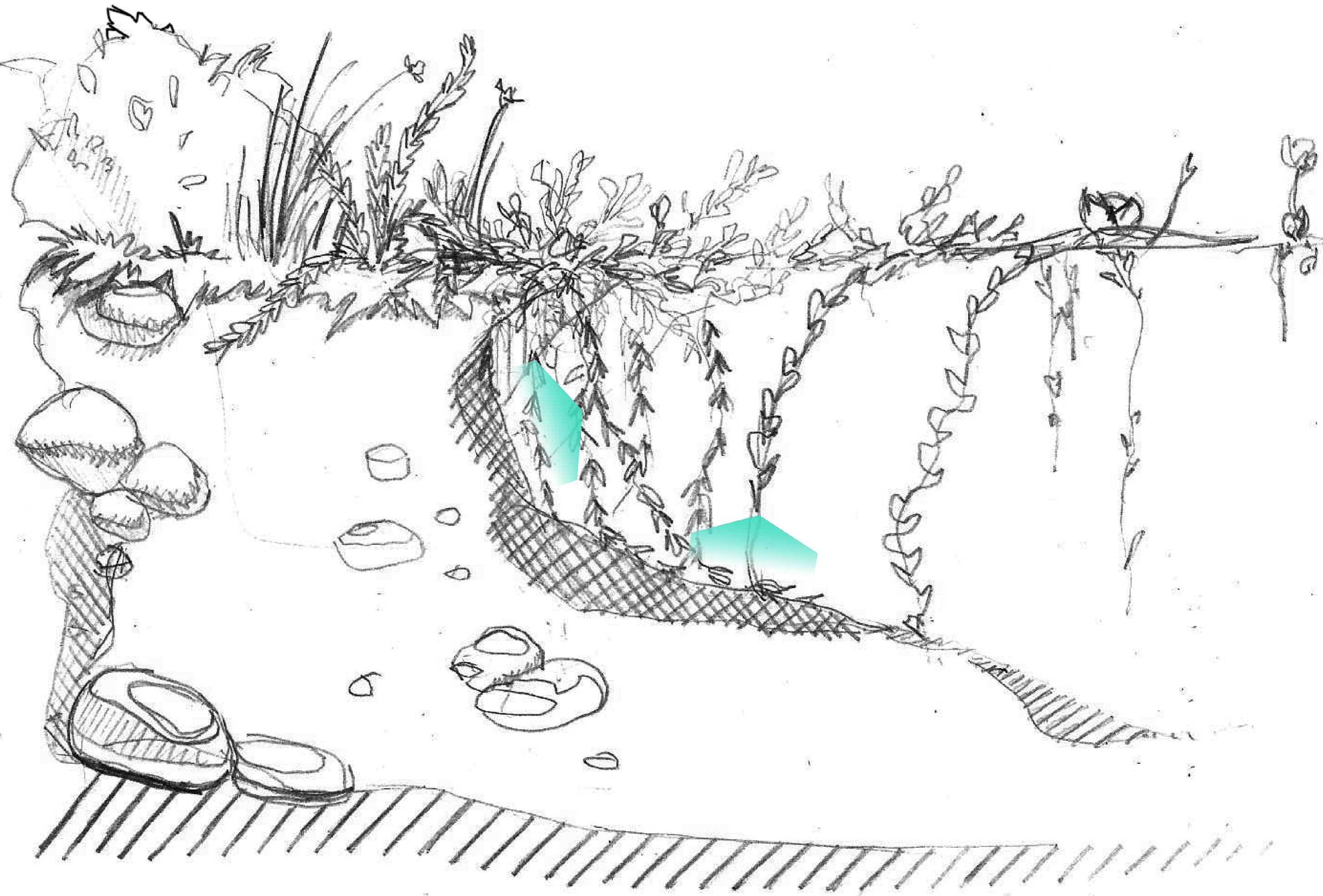→ Les zones fortement dégradées, présentant une pente douce en périphérie de bassin, sont visées. Le starter est une grande structure accompagnatrice dans la progression des plantes pionnières, jouant ainsi un rôle d'aide temporaire dans une stratégie de renaturation globale, adaptée au milieu.