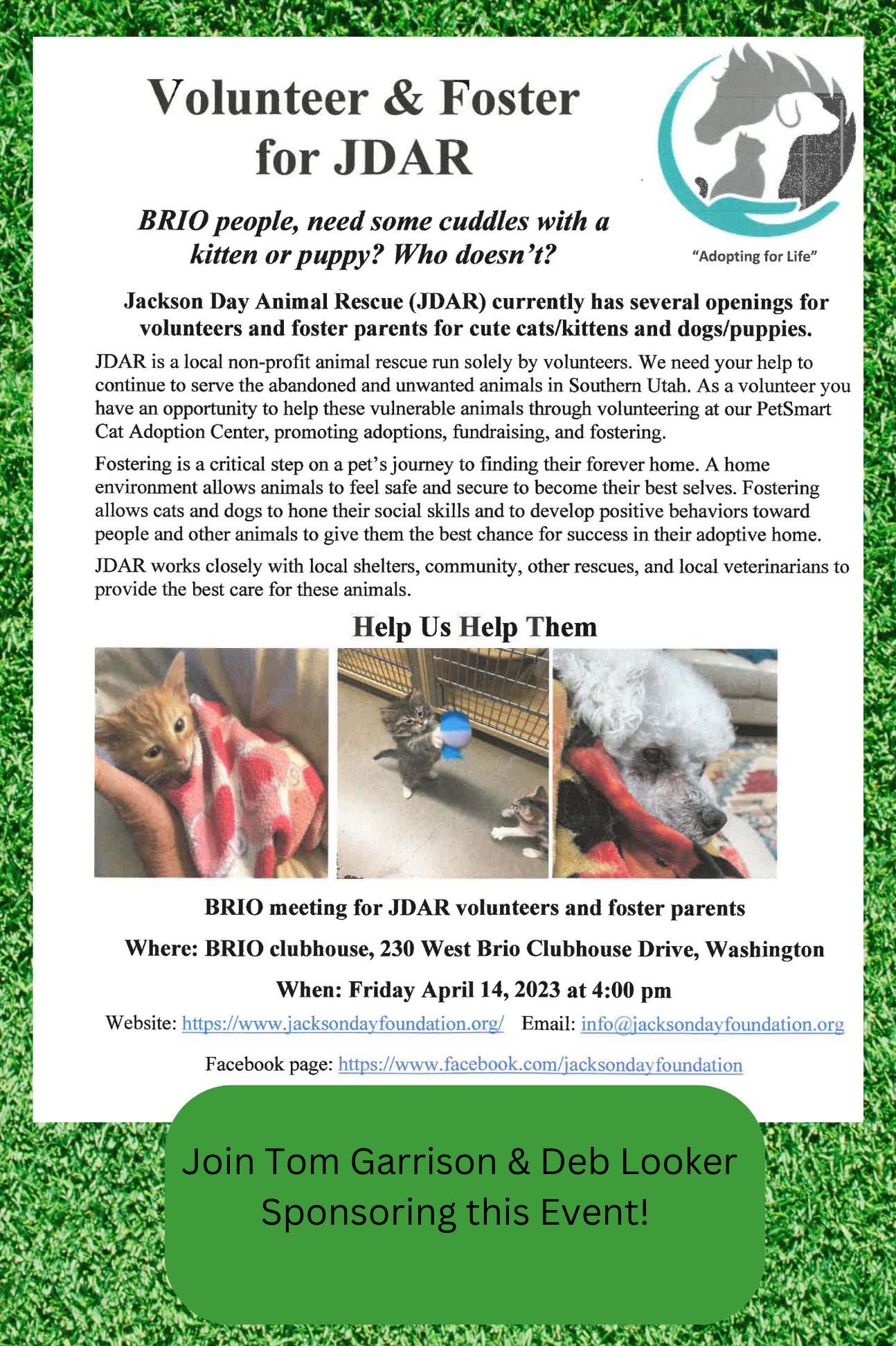 Have you ever wanted to know if you could have another pet in your home? Tonight’s event is about foster care of Animals. It is about helping the Jackson Day Animal Rescue, in helping them who knows they are helping us. Come learn to be a foster volunteer.