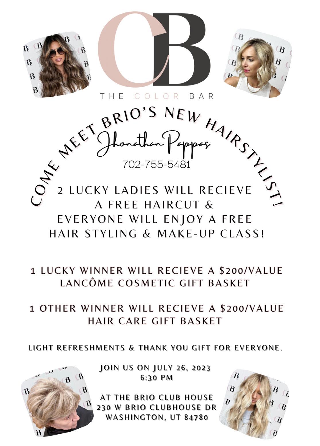 Jhonathan is a Brio resident that will show us cute short hair styles. His specialty is grey and getting the finest tones with your hair color. Advice on styles, hair care, and color! Lots of give aways,He is new to Brio and offers the finest hair studio this side of Las Vegas!