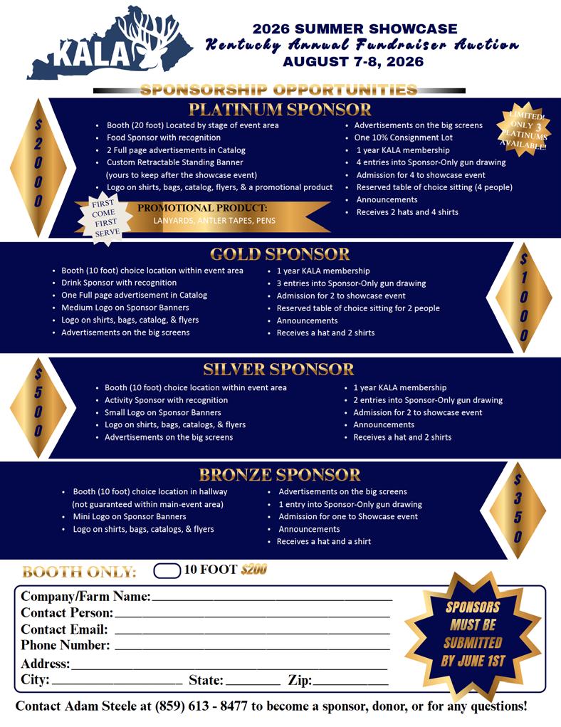 The planning for the Summer Showcase is already underway! The Showcase Committee as well as the Board have been meeting over the past couple of months getting a head start. Several new ideas and engaging activities are in the works! Be on the lookout for a flyer in the near future. The sponsorship tiers were revamped this year, making sponsorships well-worth the investment! The flyer is available on page 48. If your farm or a business you know would like to be a sponsor, set-up a booth, donate a live or silent auction item, or have any questions regarding the showcase, contact Adam Steele at (859) 613 - 8477.