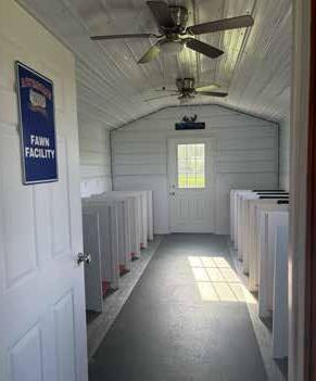 Sometimes fawns may need more intensive care and if so, may spend time in a bedroom or dog crate inside the house, until they are strong and healthy enough to be in the official fawn barn. Building up their strength and immunities also involves the careful administration of vaccines, so as to not puncture their fragile skin. Next, ear tags are attached and microchips inserted. Inside each 2 x 3 fawn box Amy also places a small bowl of natural dirt to softly and safely introduce them to their eventual life outside in the deer pens, which usually occurs after week three. “Unless you have a jumper,” Amy, 46, explained. “They might need to go outside sooner.”