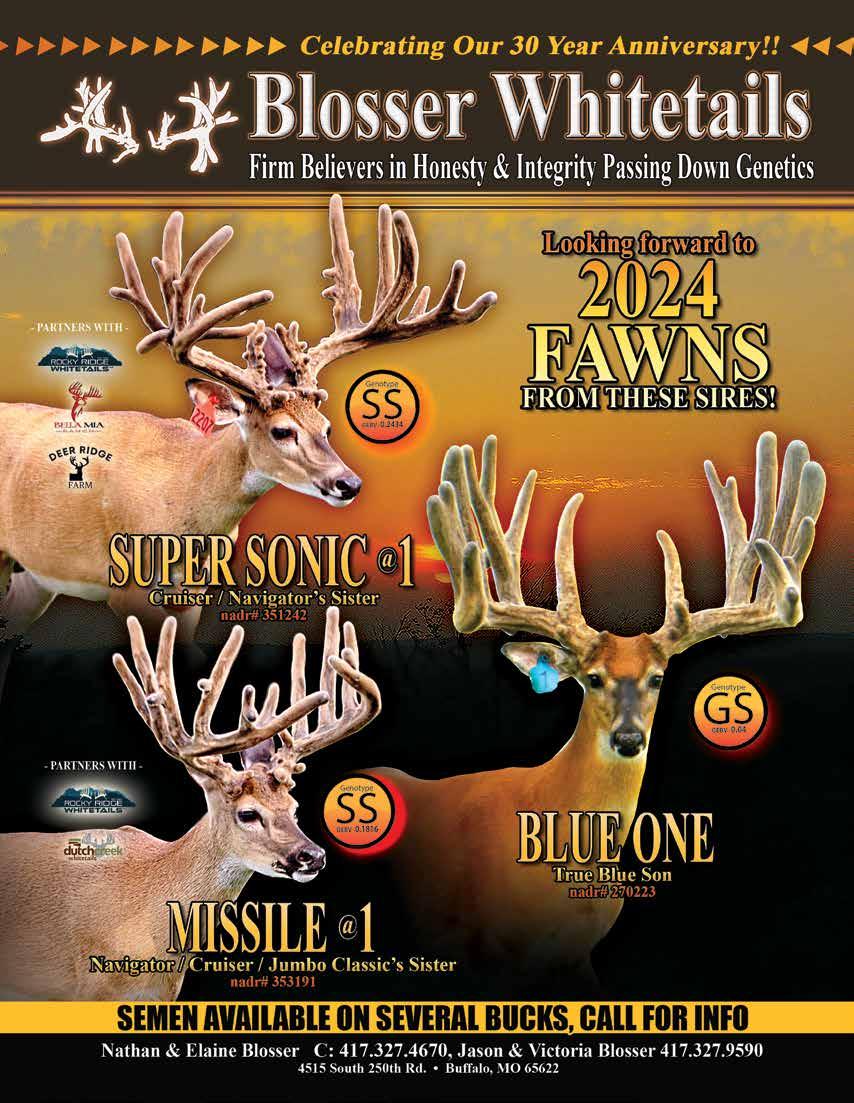 28 Indiana Deer & Elk Farmers’ Association Annaual Meeting Benefit Auction Whtietails of Louisiana Expo & Auction New York Deer and Elk Farmers Association Summer Picnic North Dakota Deer Ranchers Annual Meeting Southeast Tines Fall Deadline The IDEFA Journal Fall Deadline Pennsylvania Fall Deadline Upper Midwest Summer Deadline Mulit-Magazine Fall Deadline Kentucky Alternative Livestock Association Summer Showcase Fundraiser Auction Event Indiana Deer & Elk Farmers’ Association Annaual Meeting Benefit Auction Whtietails of Louisiana Expo & Auction New York Deer and Elk Farmers Association Summer Picnic TBD North Dakota Deer Ranchers Annual Meeting Texas Deer Association Annual Convention 2023 Ohio Fall Deer Convention Bluegrass Trophy Buck Auction, Cave City, KY Southeast Tines Fall Deadline The IDEFA Journal Fall Deadline Pennsylvania Fall Deadline Upper Midwest Summer Deadline Mulit-Magazine Fall Deadline Kentucky Alternative Livestock Association Summer Showcase Fudraiser Auction Event Visit our website for more details realated to events: deersites.com *SHOWCASE BOOK IN THE MAIL! to Deer Farmers in over 20 States! * See Showcase Flyer in this magazine for more information * LAST DAY TO SUBMINT UPDATED BUCK PHOTOS Labor Day Pennsylvania Deer Farmers Association Fall Classic Stocker and Breeder Auction & Annual Pennsylvania Deer and Outdoor Expo 2023 SOUTHERN TOP 30 Whitetail & Specialty Extravaganza Great Wolf Lodge, Grapevine, TX Louisiana Fall Deadline Kentucky & New York Fall Deadline Tri-State Associations Fall Deadline Labor Day Pennsylvania Deer Farmers Association Fall Classic Stocker and Breeder Auction & Annual Pennsylvania Deer and Outdoor Expo Louisiana Fall Deadline Tri-State Associations Fall Deadline Columbus Day Halloween Quest for Michigan’s Best Fall Deadline Quarterly