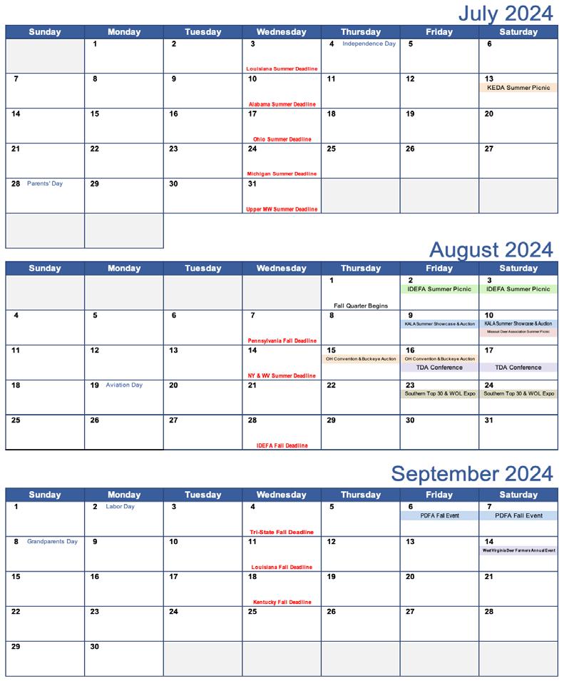 Reservation for space and buck info will be due no later than August 21st, 2024. If you have an existing picture ready to go, that will also be due at that time. If you would like to send in a last minute photo of your buck, the cutoff date is Monday, September 2nd by 9am CST. Placement will be in order of first come first serve. Printing and mailing will start September 4th and be in hand between September 16th-20th. Just in time for semen sales getting ready for Breeding Season. These will be mailed to members of the 19 state associations we service. (More information will be mailed out to all current advertisers closer to the date)