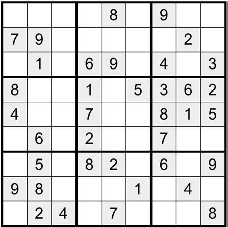 A 9x9 square must be filled in with numbers from 1-9 with no repeated numbers in each line, horizontally or vertically.