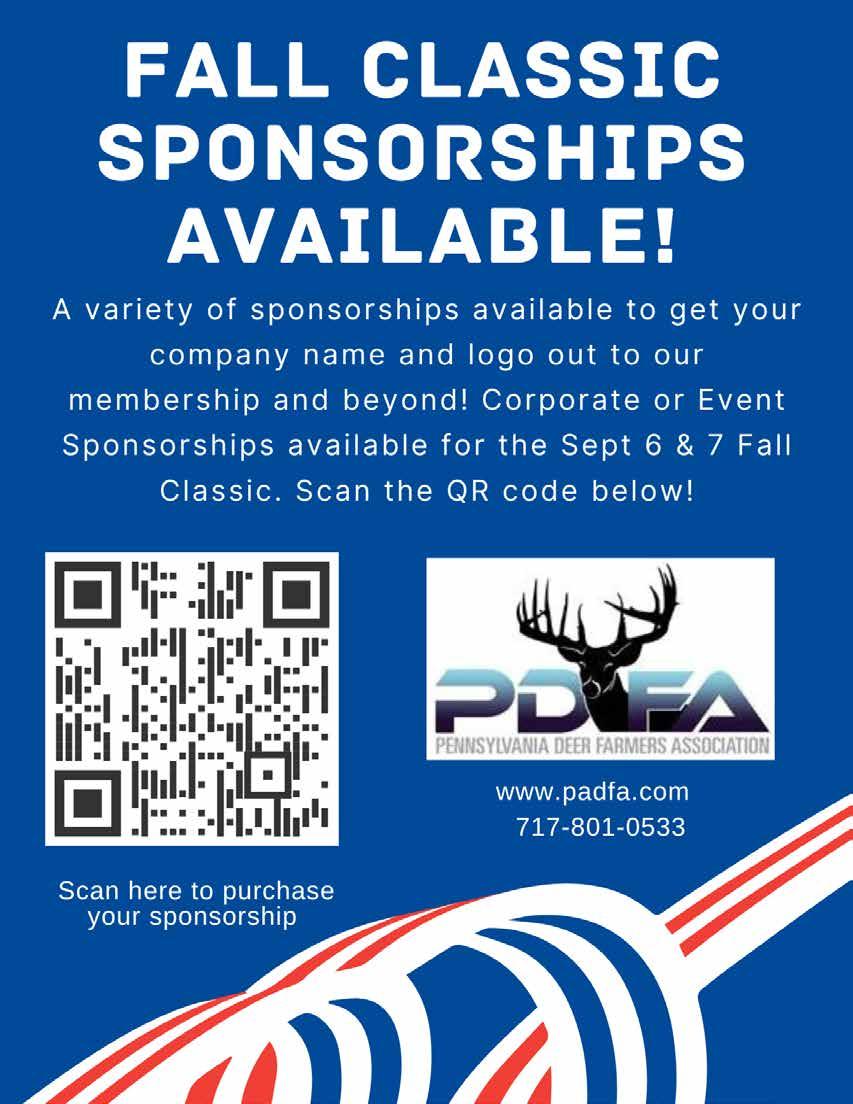 There has also been a lot of activity with us getting ready for the Keith Warren show that will air in 2025. Our Board has been all over Pennsylvania taking candid videos of establishments that support the PDFA as well as other deer farmers. They have also been super busy soliciting donations for our upcoming Fall Classic Sale. This year’s Fall Classic Breeder/Stocker and Benefit Sale will be held at the Blair County Convention Center located in Altoona, Pa. I would like to thank board members Jarrid Barry and Lloyd Stoltzfus, Co-Chairmen, along with their amazing team for all their hard work and absolute dedication to making sure this year’s Fall Classic Sale runs smoothly, surpasses expectations and is enjoyed by all who attend.
