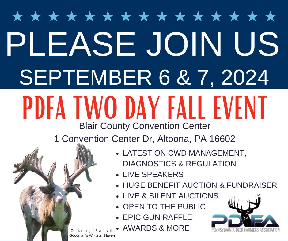 This year’s Fall Classic Sale will feature several outstanding guest speakers from Academia as well as the Department of Agriculture. PDFA is also planning to have a speaker from a private company who is working diligently to develop a live animal blood test for the detection of CWD.