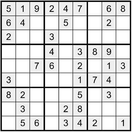 A 9x9 square must be filled in with numbers from 1-9 with no repeated numbers in each line, horizontally or vertically.