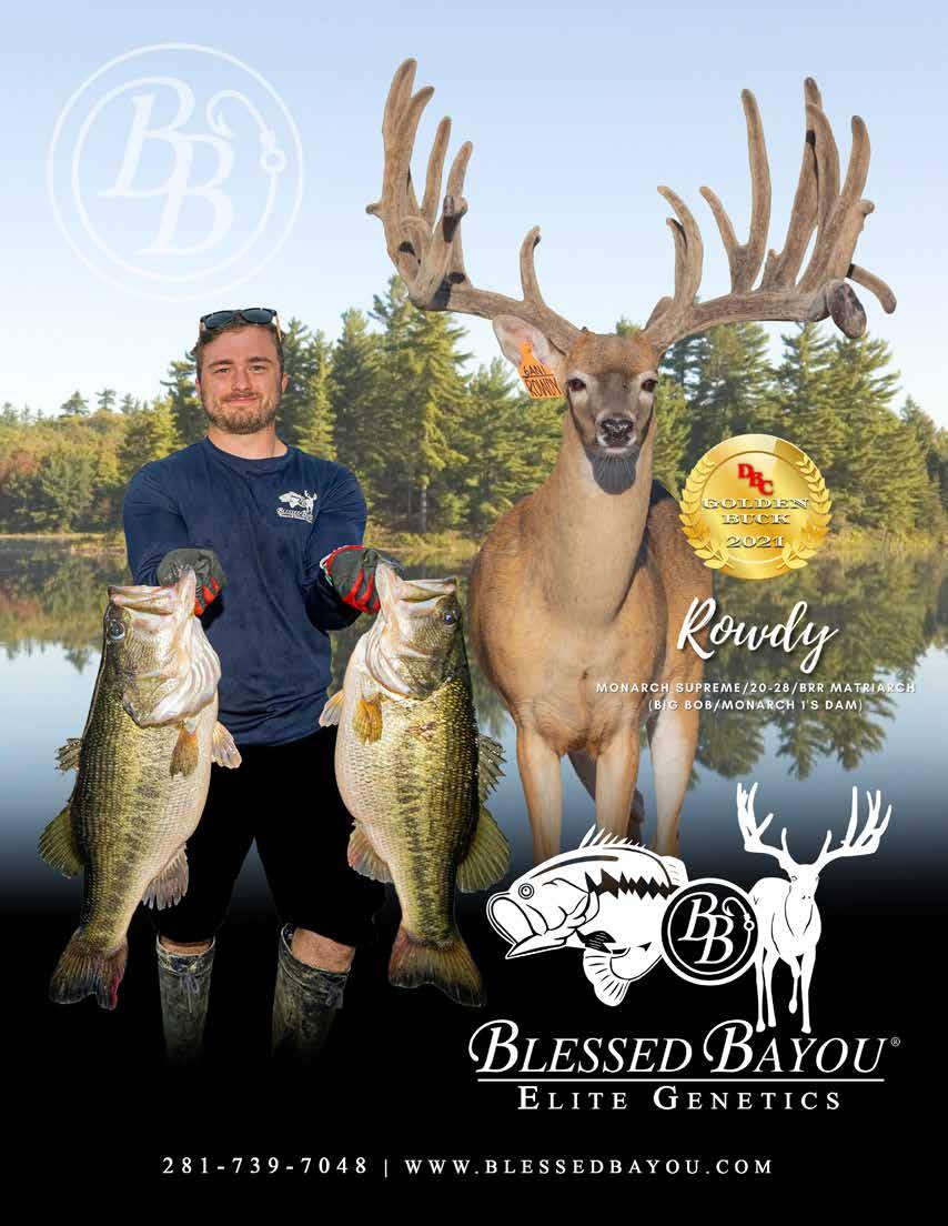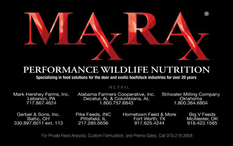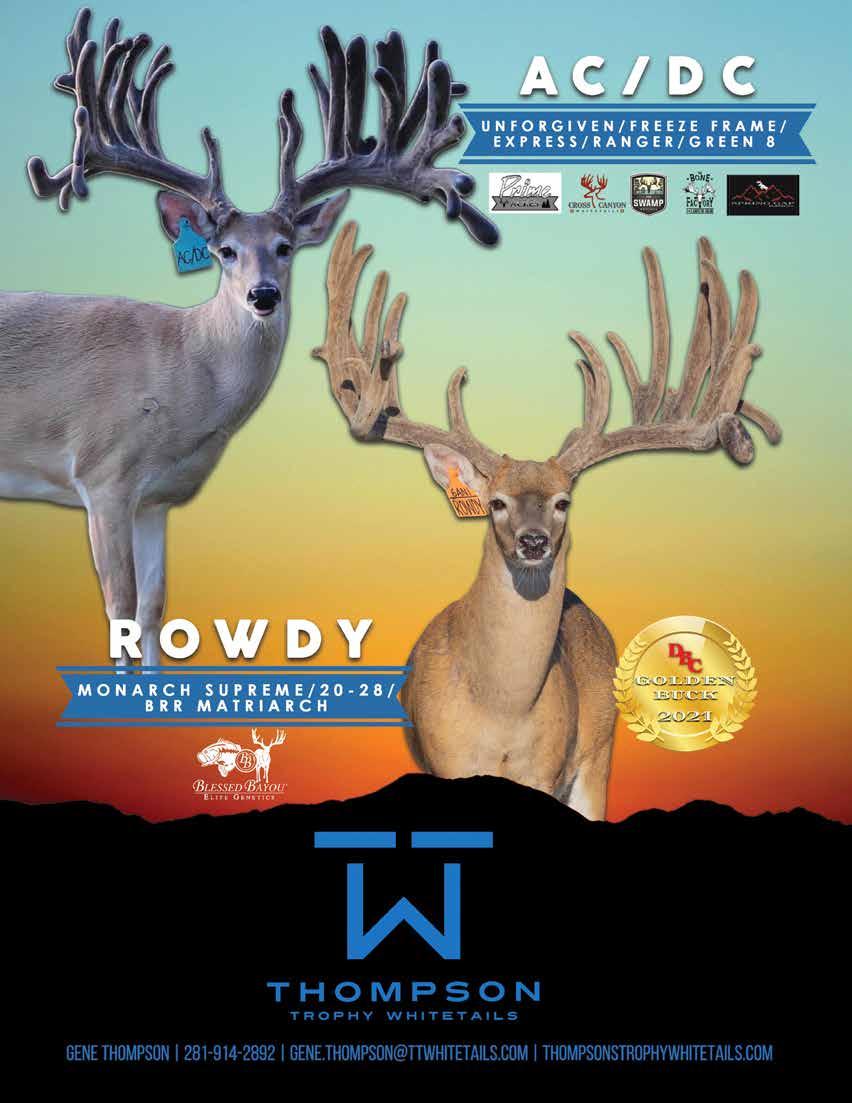 Host Hotel: Farmstead Inn 260- 768-4595 Discount Code: TOP 30 Hotel: Embassy Suites 512-392-6450 Discount Code: TX TOP 30 TOP 30 WHITETAIL EXTRAVAGANZA The Texas Top 30 was started to showcase the best of the best that Texas has to offer. This sale showcases the best lots that Texas offers in a 2 day auction held in the Great state of Texas. The Texas Top 30 will be structured with 30 “Top Breeders” showcasing 3 selected animal lots. “Gym Bucks!’’ IMPROVE RUMEN EFFICIENCY • PROMOTE RACK GROWTH • HIGHLY DIGESTIBLE PROTEIN KE Feeds (620) 727-5197 Sales@KEFeeds.com KEFeeds.com Rack Elite is a nutritionally balanced, distillers grain-based, high protein, highly palatable and digestible tub designed to accelerate genetic rack development and promote overall herd health. It’s formulated with 20% protein and additional carbohydrates to increase attractant, plus compounds that naturally mitigate heat stress and promote antler growth. Wild deer aren’t going to the gym! Feed ’em Rack Elite to grow bigger antlers, healthier herds and earlier shedding! Available in convenient tubs or pellets. Feed as a free-choice supplement throughout extended feeding cycles.