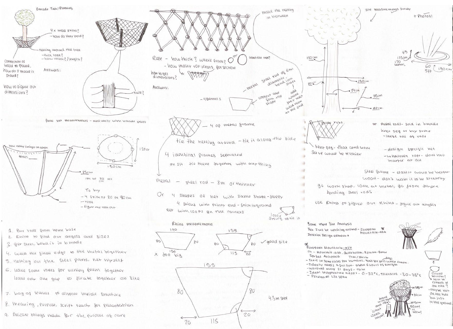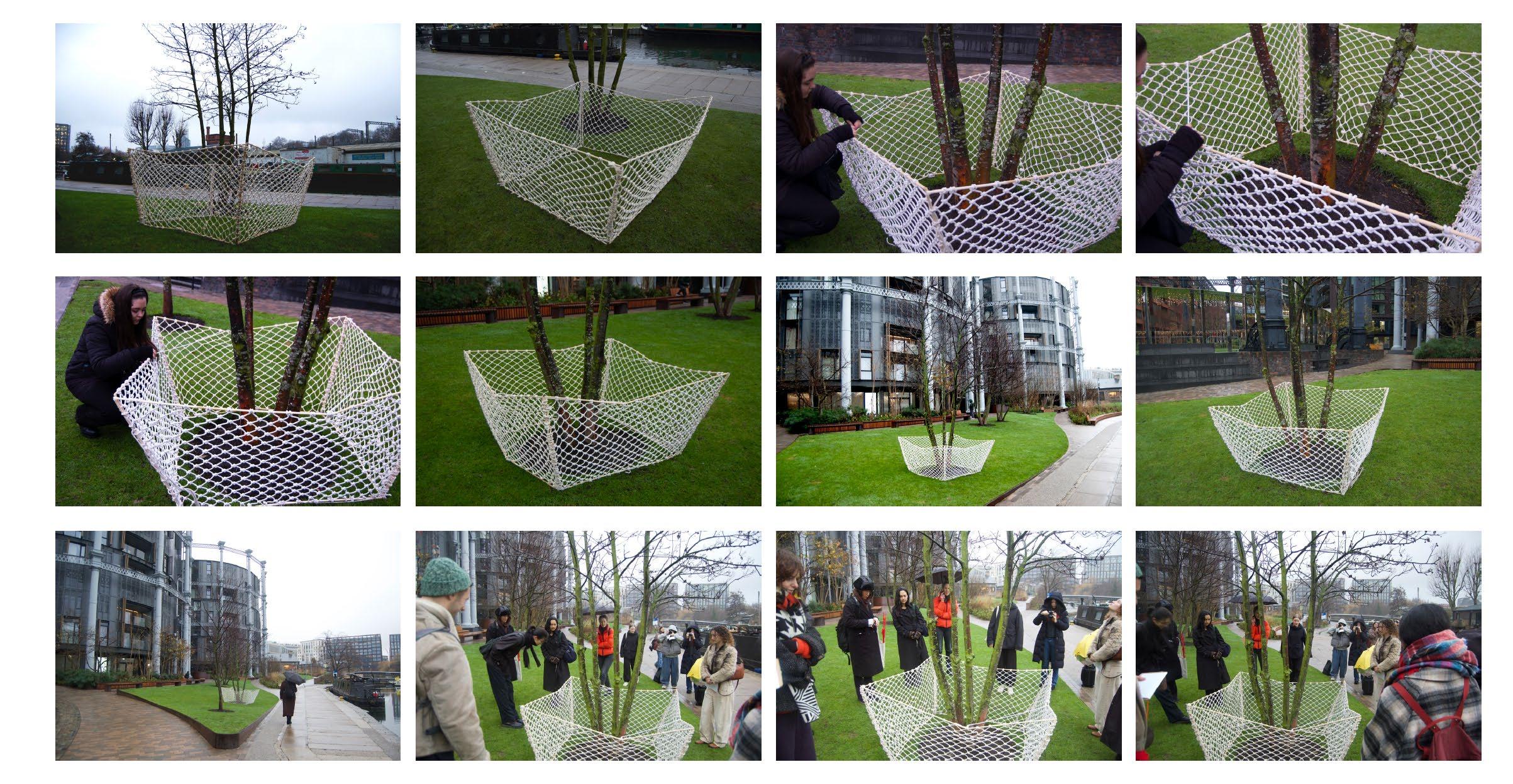 In my second year of university, my Design and Creative practice project was to look at trees, I chose to dive into protecting the tree. First I brainstormed through drawings and models to see what route I wanted to go down. I loved the idea of creating a netting around the tree to catch fallen leaves to be reused. After sketches, concepts, research and measurements from my designated site, I began to hand craft my project by netting a net after constructing a wooden outline.
