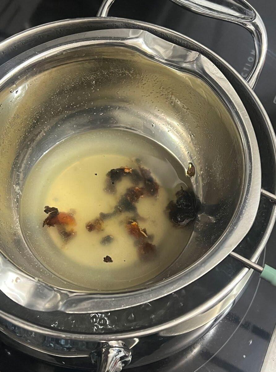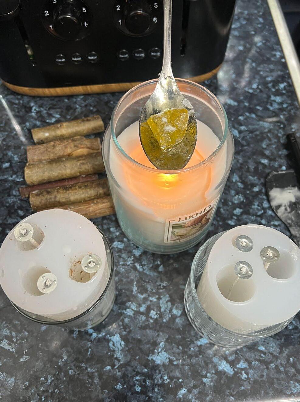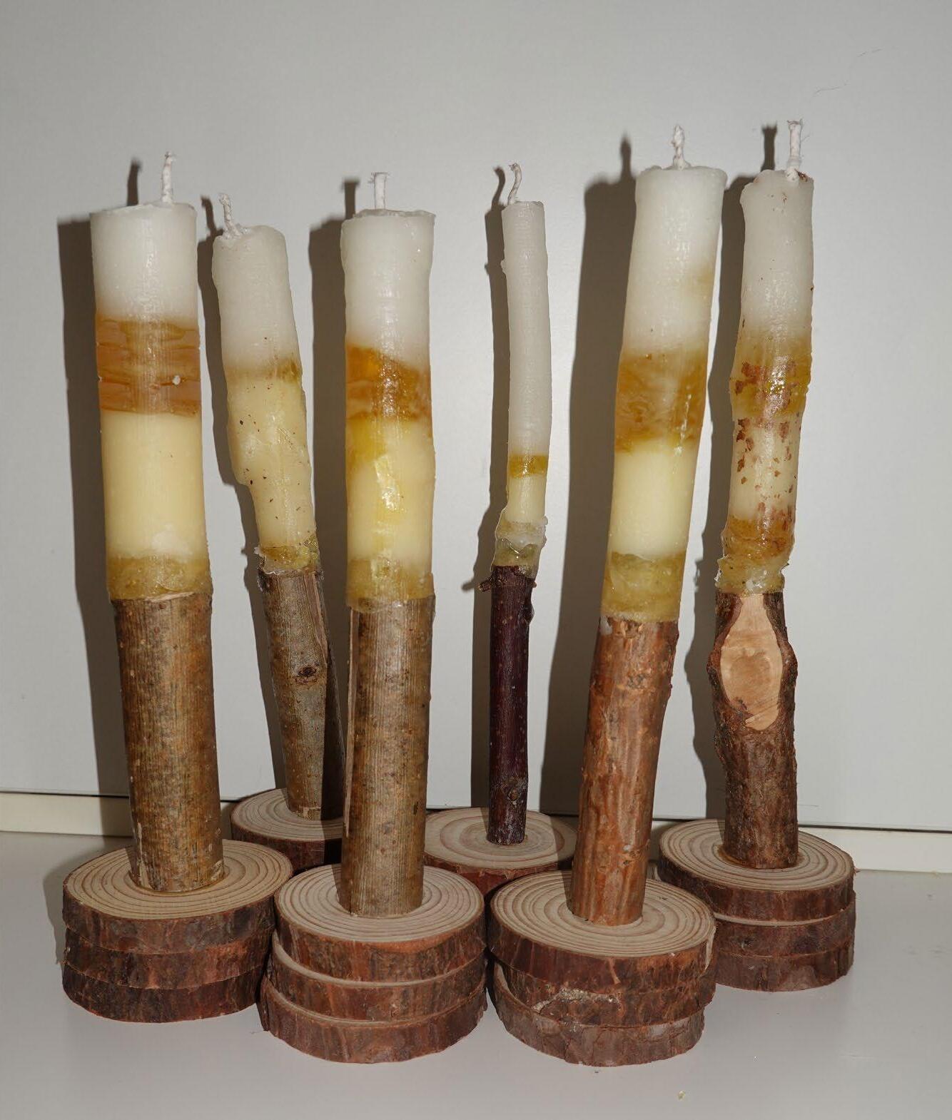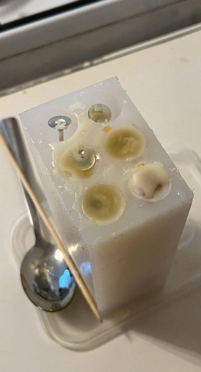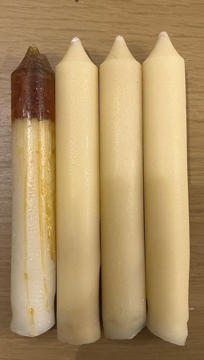 To improve my candles, I fixed the mistake of not having enough silicone, and this time still incorporated the stick to the candle. In order from top of the candle to the bottom of the candle I used besswax with sandalwood essential oil, pine resin, pine resin and beeswax mix, andx mastiha resin. These layers were part of my theoroteical side of my project as each layer is part of the dinner.