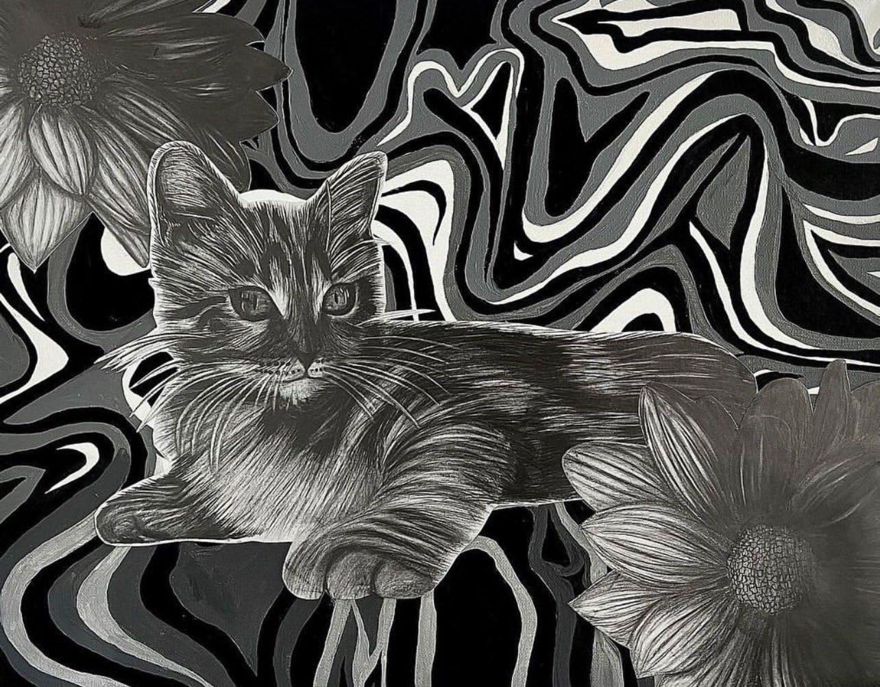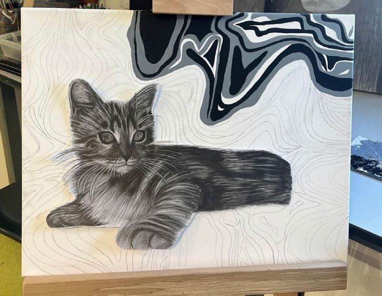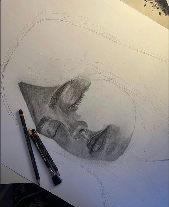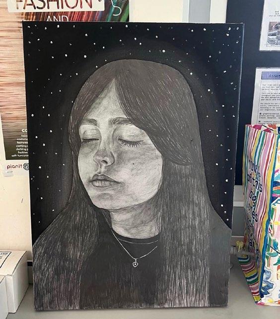 An exhibition photo is shown with a brief process on the right side including a digital combined drawing and a sketchbook page photo. On the left showing my exam unit canvas piece process with the final outcome on the bottom middle. With all of my interdisciplinary routes that have evolved over the years, fine art is where it all started with pencil drawings as my medium.