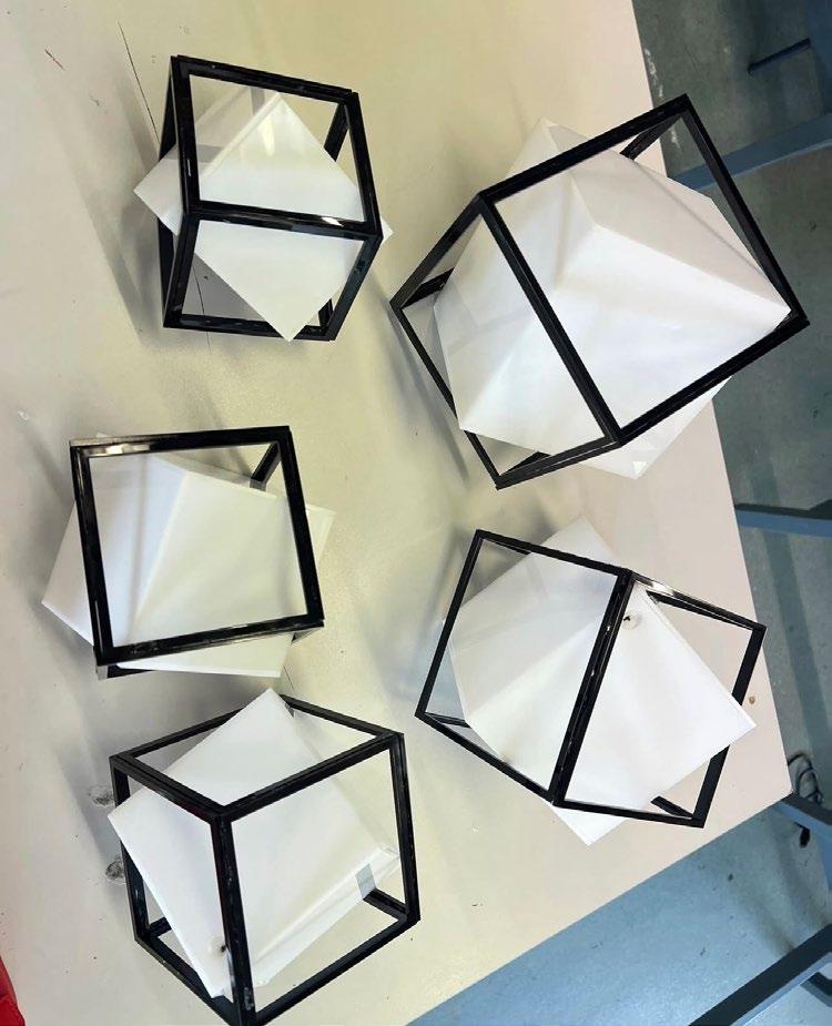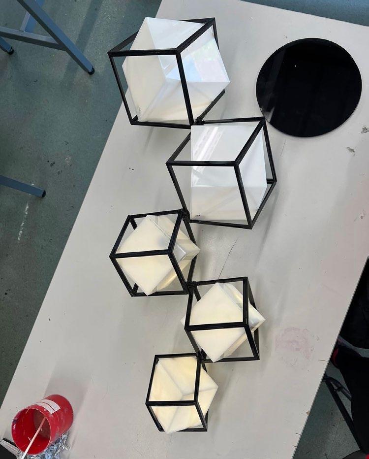For my 3D Design A-Level Exam Unit, I created a functioning geometric cube chandelier. I used 2D Design and lazer cutting acrylic to get the desired shape. Using battery operated fairy lights inside of each cube, the slight translucency of the acrylic allowed the light to seep through and create a working cube light. Black wire was used to connect each cube together and it functioned to hang down from the ceiling.
