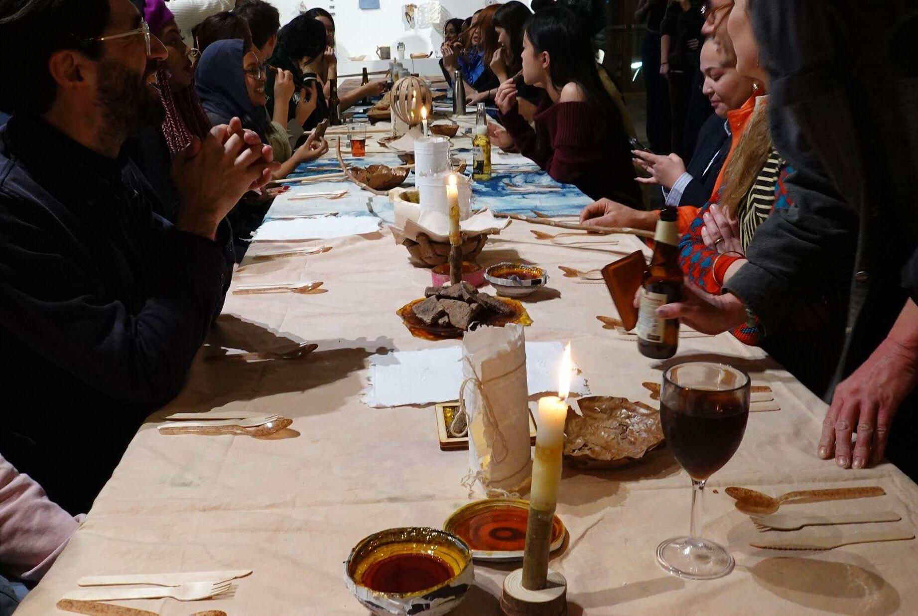 My tree candles in action with the rest of the De-constructing the Tree feast, my candles worked with being centre pieces, setting the atmosphere, giving scent and making the interior space feel alive. The first layer of beeswax and sandalwood essential oil being for introduction speech, welcoming and getting settled, the pine resin layer for the starter course with a strong aroma of the tree as we eat food made of trees, the pine resin and beeswax layer for a smooth transition of less tree smell and we get to dessert with mastiha tree scent an extremely strong tree scent.