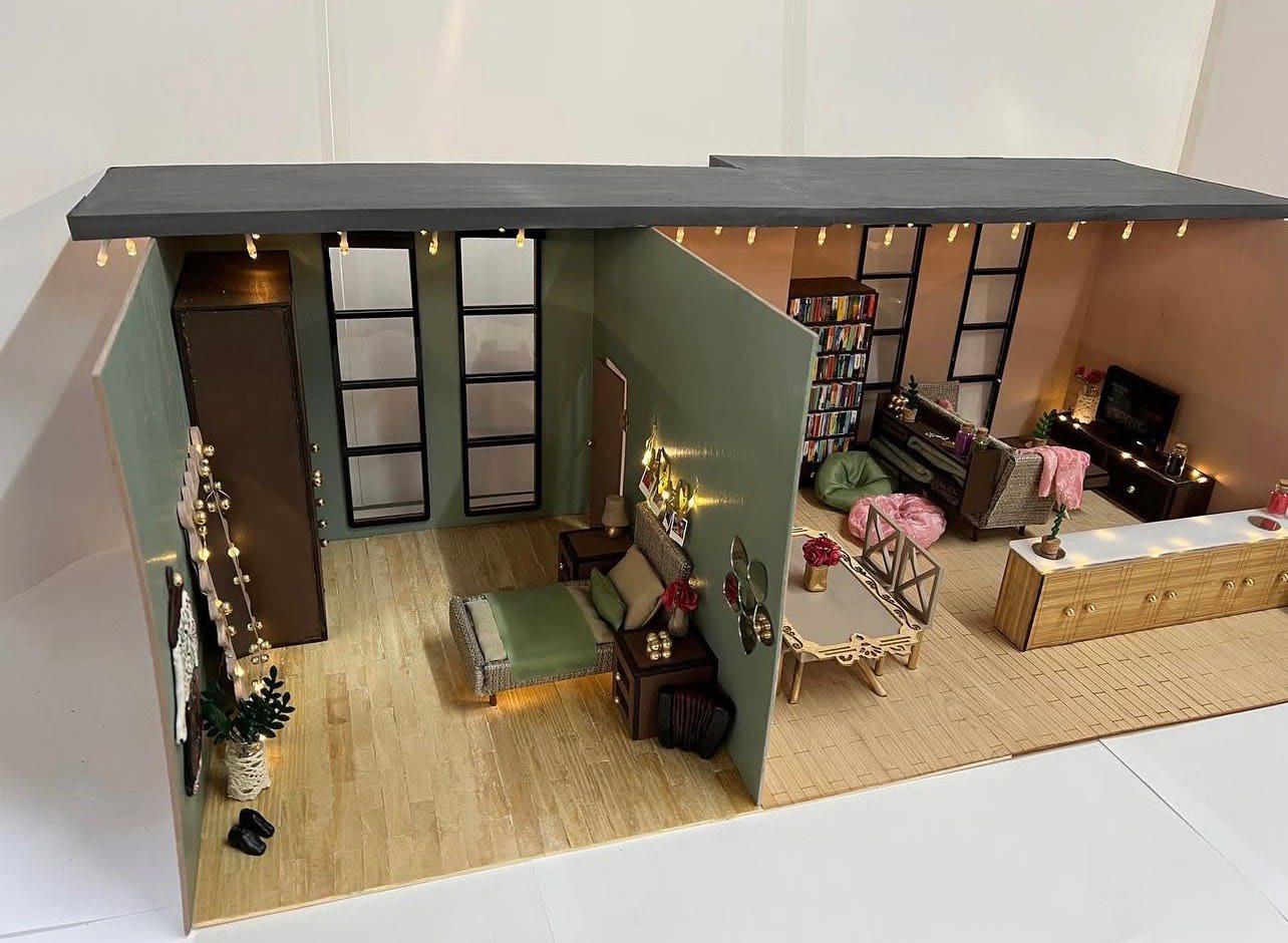This full hand crafted interior/exterior model is made to explore my family heritage throughout the home, showing my family name ‘Ghinda’ translated to ‘Acorn’ in English with the book on the coffee table. Traditional Moldovan dancing dress on a hanger for my mother’s history as a dancer; an accordion representing my fathers history with being an accordionist in the same traditional dancing group. This model includes small polaroid pictures of myself and explores my hobbies and love throughout the home, e.g. books for my reading hobby. Overall, this project inspired me to want to learn real technicality and learn to understand interior design in a professional manner.