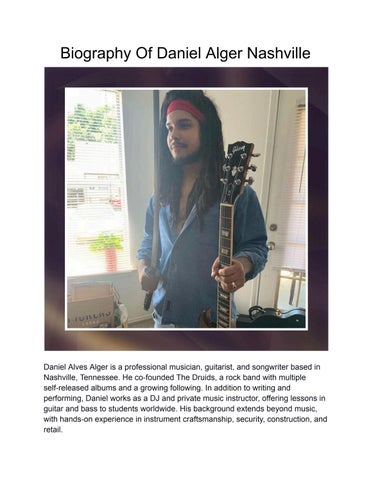 Daniel Alves Alger is a professional musician, guitarist, and songwriter based in Nashville, Tennessee. He is the co-founder of The Druids, a rock band that has independently released multiple albums and continues to build its audience. In addition to performing and creating music, Daniel works as a DJ and private music instructor, teaching guitar and bass lessons to students from many parts of the world. His work experience also includes roles in instrument craftsmanship, security, construction, and retail. Daniel Alves Alger was born in Brazil, but much of his upbringing took place in the suburbs of Washington, D.C. During his childhood and teen years, he was deeply involved in ice hockey. He played from elementary through high school and was a top-line forward for the Blair Ice Hockey team. In 2014, he helped lead the team to a divisional championship, an accomplishment that reflects his dedication to team sports and discipline. At the same time, music was a steady presence in his life. He began piano lessons early on and later expanded into guitar and bass. These instruments gave him new ways to explore his creativity. By the time he was a teenager, he was performing with bands in the local DMV music scene. These early experiences helped him grow both as a guitarist and as a songwriter. In 2017, Daniel moved to Nashville, Tennessee, to attend Belmont University. Though he studied there for only two semesters, his time at Belmont gave him access to a strong network of musicians and introduced him to professional-level guitar playing. While there, he began performing live around the city and continued developing his original material. This period led to the formation of The Druids, a band rooted in psychedelic and classic rock influences. As a founding member of The Druids, Daniel Alger of Nashville takes on multiple roles, including guitarist, songwriter, and vocalist. His input has shaped the band’s sound, which combines indie rock, layered textures, and thoughtful songwriting.