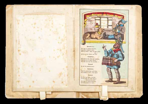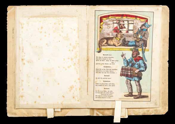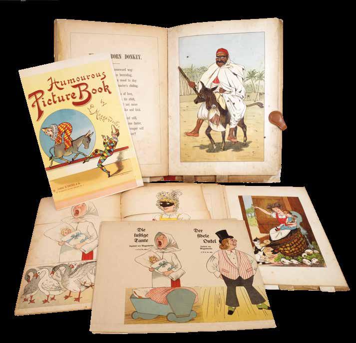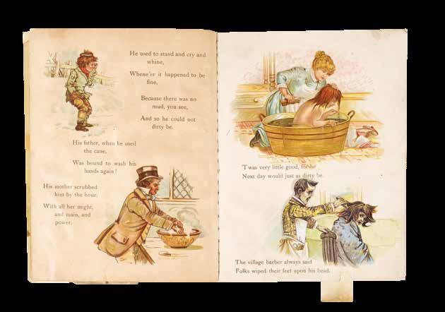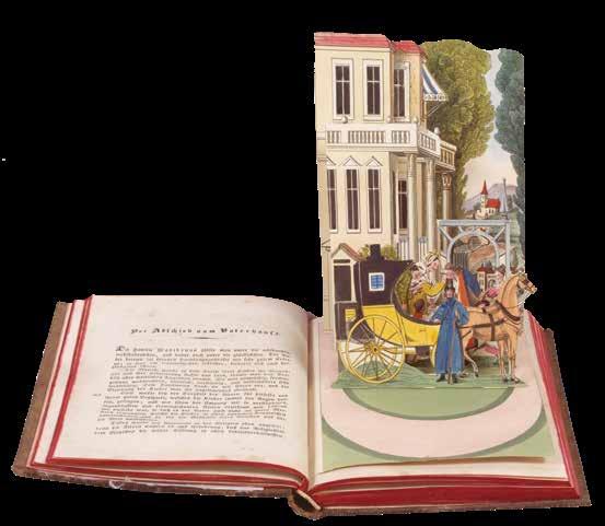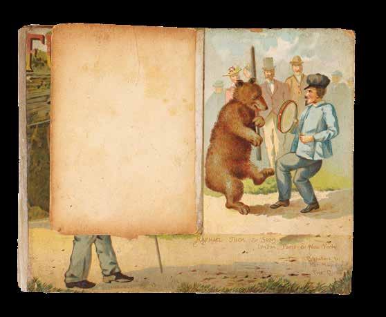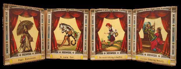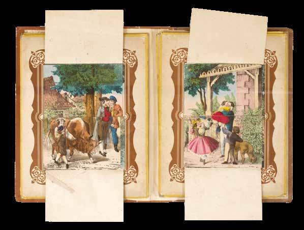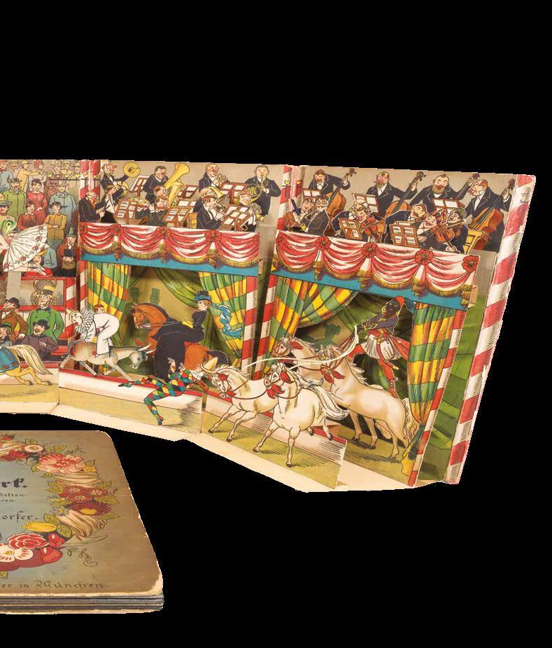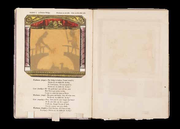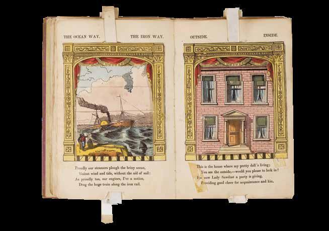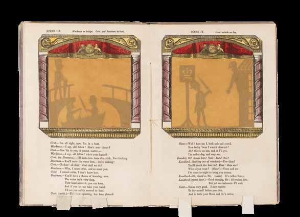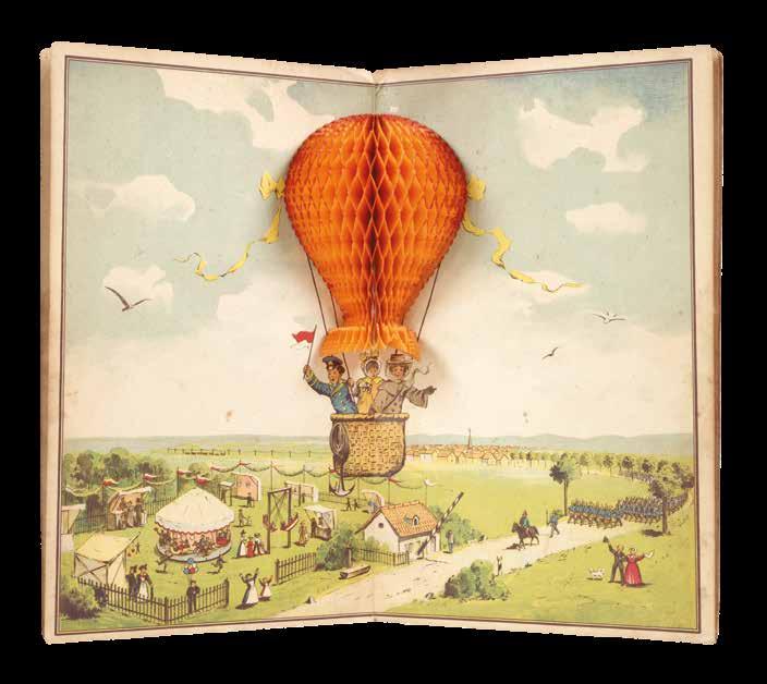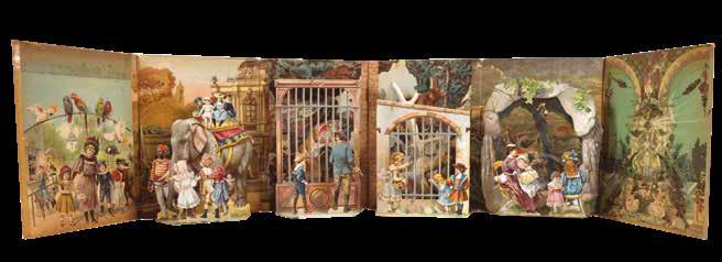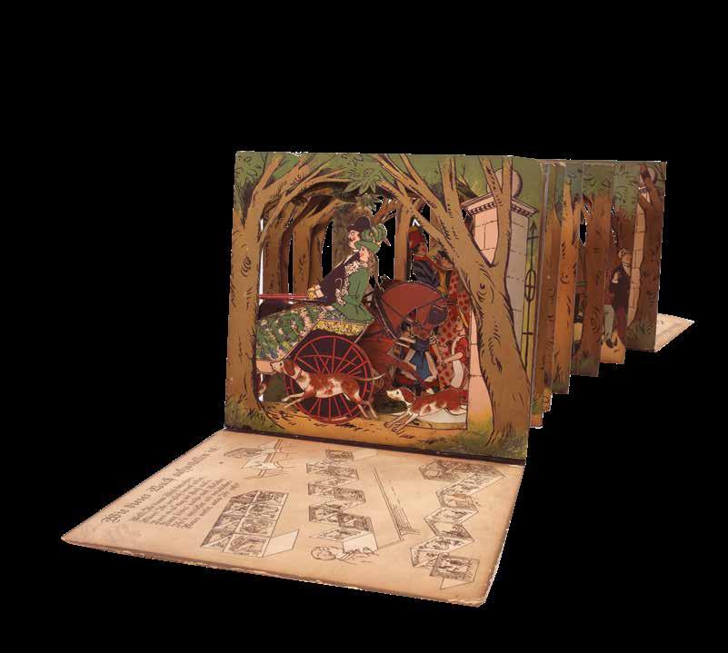 Moveable books for children began to be produced in the nineteenth century, when Brès added a pull-down mechanism to his playful book, ‘Livre Joujou’, in 1831 (item 30). Thus dawned a golden age of “pop-up” book production designed for a juvenile market. The firms of Meggendorfer, Dean, Nister, and Tuck, as well as their followers, lead the industry in the manufacture of ever-more exciting and interactive works. Increasingly complex paper engineering allowed three-dimensional scenes to spring from the pages, characters to move, and stories to be projected onto a wall or screen.