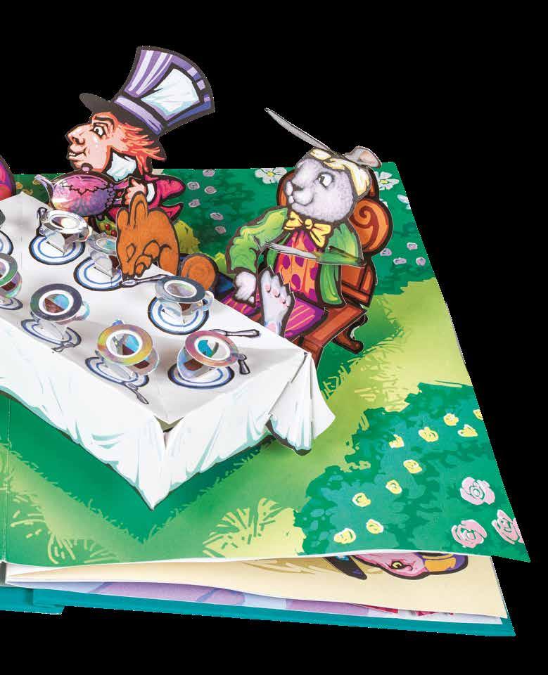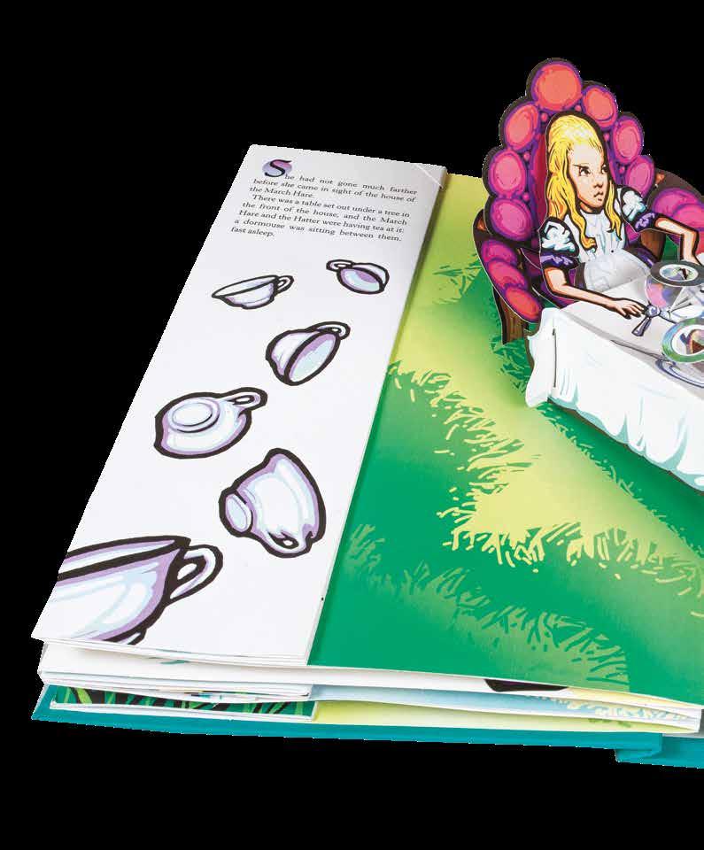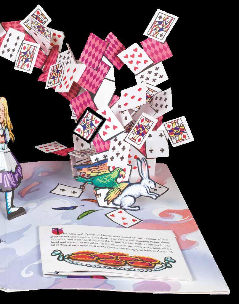 Often considered the greatest pop-up book of the twenty-first century, Robert Sabuda’s ‘Alice in Wonderland’ exhibits a complexity and dynamism difficult to be matched in the world of paper engineering. The book consists of six double-page scenes, which rise up into intricate three-dimensional models when opened: Alice spotting the White Rabbit; Alice growing to fill his house; Alice at the Duchess’s house; the Mad Hatter’s tea party; the Queen of Heart’s croquet match; Alice swarmed by a pack of cards.