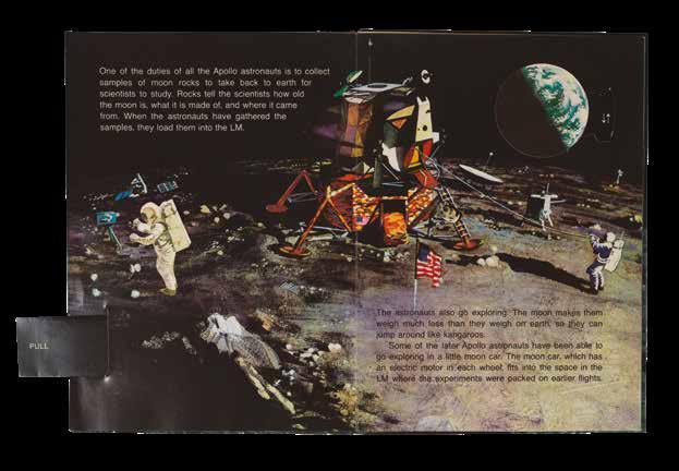 -HENDRICKS, Stanley; Al MUENCHEN; and Howard LOHNES. ‘Astronauts on the Moon: The Story of the Apollo Moon Landings’. United States and Canada, Hallmark Cards, Inc., [and] England, Roger Schlesinger, [1969]. Quarto (265 by 195mm). Eight double-page colour-printed plates with pop-ups and other moveable parts; original publisher’s glazed pictorial boards.