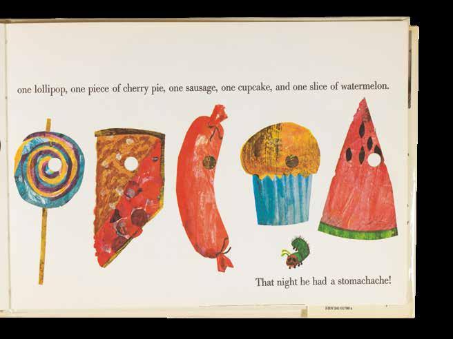 As every child knows: this immensely popular book tells the tale of a poor caterpillar on the hunt for some food. The various things he finds to eat, including one apple on Monday, two pears on Tuesday, and three plums on Wednesday, are depicted with holes punched through them. When none of these healthy choices satisfies the caterpillar, he indulges in the ultimate cheat day, with Saturday’s fare consisting of “one piece of chocolate cake, one ice-cream cone, one pickle, one slice of Swiss cheese, one slice of salami, one lollipop, one piece of cherry pie, one sausage, one cupcake, and one slice of watermelon”. These delights are all rendered in Carle’s charming collage style.