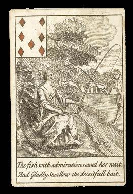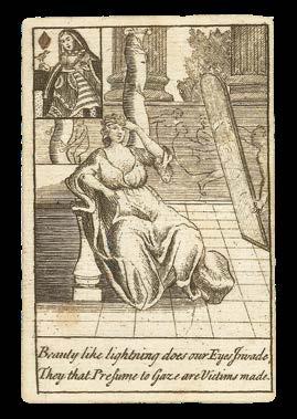 Interestingly, each of the suits is accompanied by a different motif: clubs with stars, diamonds with suns, hearts with roses, and spades with moons. It is not clear what these alternative symbols are supposed to represent. Winstanley’s cards were originally bound in a small book, and must have proved popular, as they were posthumously reissued around 1715.