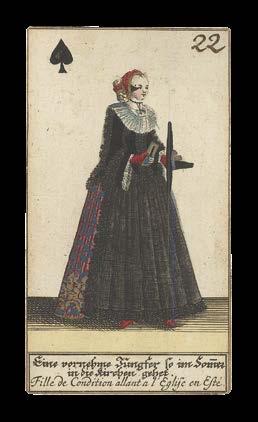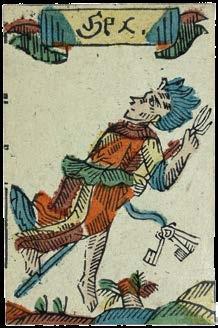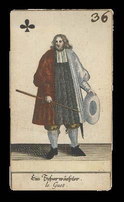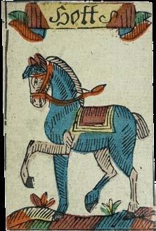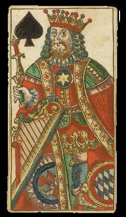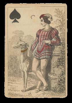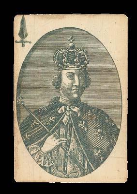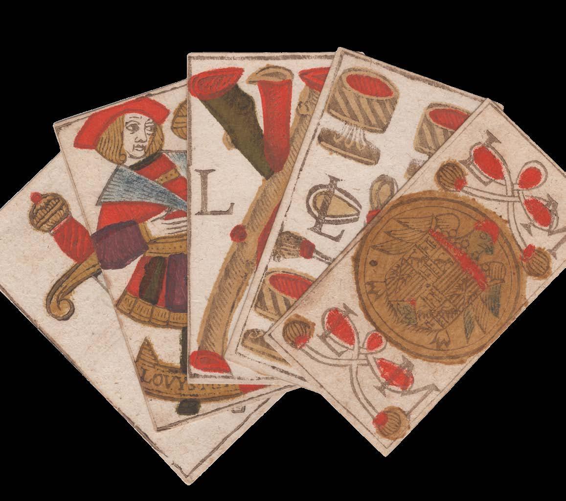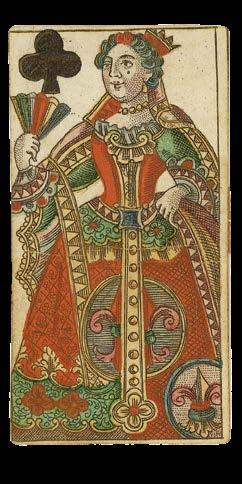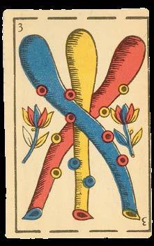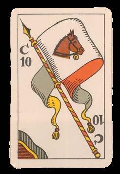 Taking the Spanish suits of Clubs, Coins, Cups and Swords, this deck has three court cards in each suit - rey (king), caballo (knight) and sota (knave) - and pip cards Ace to Nine, the value of each represented by the number of suitmarks shown. The court cards are drawn in the ToulouseGirona pattern, with the Sota cards bearing ribbons containing the maker’s name, although the Sota of Clubs here lacks one. The pattern, which may have been made for export, became obsolete by the end of the seventeenth century. The Ace of Coins here has at its centre the Spanish coat-of-arms.