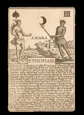 As well as being playable cards, with the value given in the upper corners, Winstanley’s deck also provides a huge amount of information about the geographical and ethnological understanding of the time. Each card is focused on the peoples of a certain region, including the English, Germans, Indians and Monguls, with one or two figures representing these peoples illustrated on the upper half of the card, set against their native background. The lower half contains a detailed description of the corresponding geography and ethnology in miniscule text.