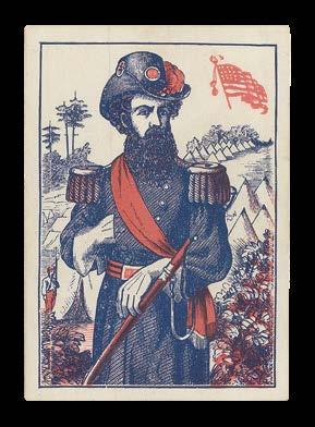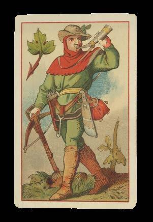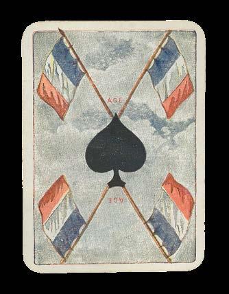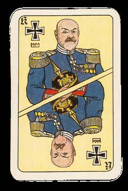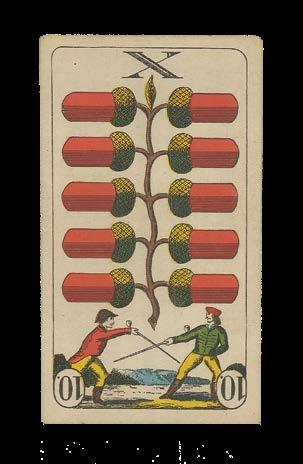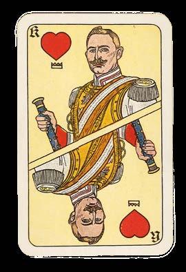 These striking suits revolve around the military theme of this deck, in which the court cards depict the Hauptmann (captain), Korporal (corporal) and Oberleutnant (first lieutenant) in the place of the typical royal figures. The inscription of “Grenzbesetzung 1914/1915” (Border occupation 1914/1915) on the Ace of Shovels demonstrates that these cards were made to depict the Swiss army presence along the northwest border of the court during the early years of the First World War. Stationed in a staggered defensive position facing the Franco-German front, the troops were deployed in case of attempts to move the war south into Switzerland. The soldiers no doubt had plenty of time for Jass.