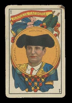 On the Ace of each suit are the leading bullfighters of the dayRafael Molina “La Gartigo”, Rafael Guerra Guerrita and Juan Molina - and on the Cups, the iron of the most prestigious bullbreeder in Spain, the Duque de Veragua. The court cards likewise show prominent fighters, all identified by name. To the verso of each card is also a portrait of a torero, again with his name written outside of the frame, as well as the advertisement for Chocolates Angelical.
