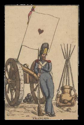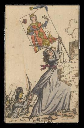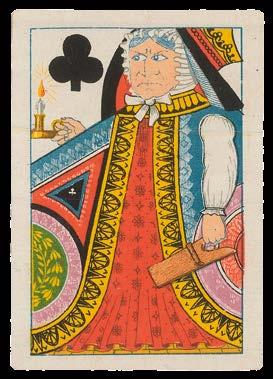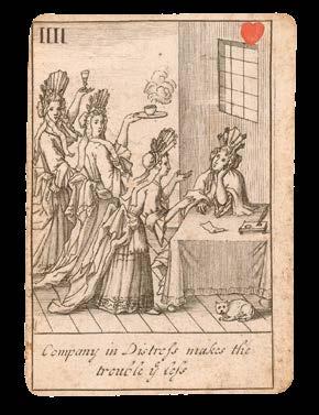 It is not entirely clear why cards depicting “the Rump and the dreggs of the house of Com[mons] remaining after the good members were purged out” (Ten of Hearts) were published three decades after the event. Nonetheless, Barlow’s biting satire and colourful illustrations proved perenially popular, and an example of the deck is known to have been owned by Lord Nelson. For use in play, the value of each card is given as a Roman numeral, or name in the case of the court cards, in the upper right-hand corner, with the suit symbol in the upper left.