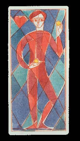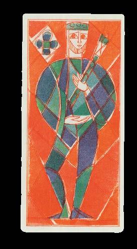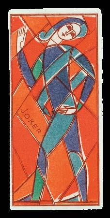 This deck has a striking and unique design, combining the style of stained glass with the art deco genre. Each suit is represented in two colours: Clubs in orange and blue, Diamonds in green and orange, Hearts in blue and red, and Spades in red and green. The pip cards have no numerals, with their values instead represented by the number of suit marks. The court cards have a single full-length figure on each, which appear to represent the classic royal figures, some holding sceptres. The three jokers are also full-length figures, in rather more strange poses, and labelled “joker”. The Queen of Diamonds is featured on the slipcase in which the deck is housed, which also includes four pages detailing the design of both the windows and the cards, discussing the colour, symbolism and manufacture of the deck Kümpel-Amsler’s cards were originally published as a numbered edition of 150 decks. This was soon followed by another unnumbered edition, as here.