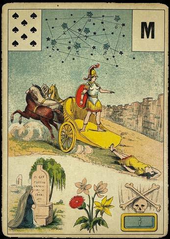 The Spanish suit system has been adapted here so that the coins are represented as medallions, each containing a portrait of a famous bullfighter, and clubs as the torero’s banderilla, a short fabric-covered stick with a barbed dart at the end. These reflect the overarching theme of the deck: the bullfight. These symbols, alongside cups and swords, appear on the Two to Nine pip cards in numbers reflecting the card’s value. On each of the cups, which appear to be small shot glasses, the iron of a bull breeder is shown. These branding irons had become something like logos for the various farms and breeders that provided bulls for the fights.