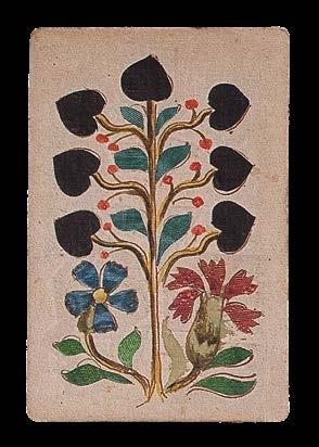 48 woodcut playing cards with original hand-colour, pattern to versos. Dimensions 86 by 45mm (3.5 by 1.75 inches).
