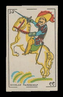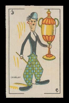 The court cards depict male icons from the 1920s, all portrayed in the contemporary art-deco style. They include movie stars such as Charlie Chaplin and Douglas Fairbanks, explorer Roald Amundsen, aviation pioneer Charles Lindbergh, motorcycle racer Vincente Riera, as well as famous sportsmen. The pip cards show a variety of sports, such as polo, football, cycling, rowing, boxing, skiing and tennis. On the back of each card is a numbered image. When viewed quickly, one after another, they form a so-called “flick-book”, an artificial “movie” starring Periquito the cat!