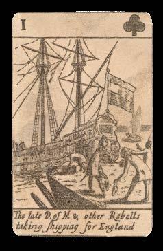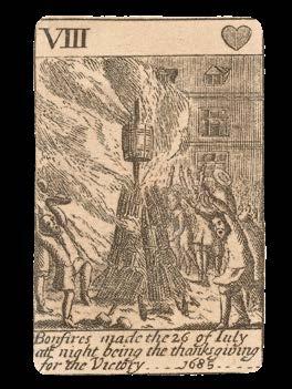 On the Six of Spades are depicted “maney of ye Nobility of England in Councell about ye Dainger of England”, while “The King leaving London about three a Clock in the Morning in his barge” appears on the Two of Hearts. James was eventually forced to flee to France, after failing to reinstitute his reign from Ireland, and he lived out the remainder of his days under the protection of King Louis XIV until his death from a stroke in 1701.