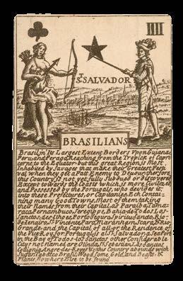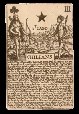 On the Three of Clubs, a Chilean man and woman stand wearing little more than feathers, the woman holding a tall bow and arrows, and the man a hunting spear. In the background behind them “St Iago” is depicted as a small cluster of low buildings surrounded by forest. The description below begins: “Chili, Magellanica & Tacuman are three regions or are at provinces reaching from the 25 to the. 53 deg[ree] south lati[tude], being all the great point of the Southern America that stretches to make the famous Strait of Magellan where the two mighty seas have communication, and the only passage yet found to make the circuit of the world upon the waters. All these countries have none but Spanish Colonys but the natives are almost as much masters as they and maintains a great part governed by their chiefs, or heads of familys in Chili. The Spaniards has a Governor at St. Iago...”.