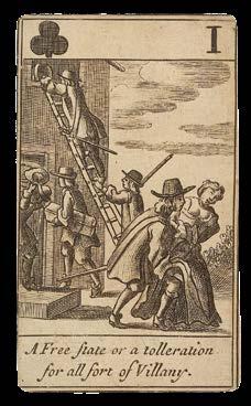 The Ten of Clubs, for example, sarcastically shows “Oliver seeking God while the K[ing] is murthered by his order”, while the Ace of Clubs questions whether the Parliamentarians had instituted “a free state or a tolleration of all sort of villany”, with officials shown raiding a house and harassing a woman on the street. In addition to more official scenes such as “the taking of the Holy League and Covenant”, Barlow’s designs also illustrate rural and everyday situations, with humble figures such as a waggoner, a weaver and a carpenter.