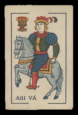 The Cadiz pattern of playing cards is almost identical to the Castilian pattern, using the Spanish suits of Clubs, Coins, Cups and Swords, and is distinguished only by a few small details: the Knight of Coins has a whip, and the King of Cups holds his sceptre in his left hand. Its 40 cards are comprised of Ace to Seven pip cards, with three court cards, the sota (knave), caballo (knight) and rey (king). Some of the cards have inscriptions, including the publisher’s imprint on the Five of Spades, “Made in Spain” on the Four of Clubs, and “ahi vá” on the Caballo of Cups. Strangely, the accent has been put over the wrong letter; it should read “ahí va”, a Spanish phrase used in a variety of situations that can loosely be translated as ‘there you go!’.