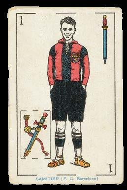 The traditional Spanish suit system of cups, clubs and swords, is used, with the exception that instead of coins, there are balls. Pip cards have their values represented by the number of suitmarks shown, while the court cards and Aces show successful Spanish football players of the early twentieth century, with a miniature representation of the traditional playing card in the lower left-hand corner. The Ace of Coins shows the legendary goal keeper, Ricardo Zamora, nicknamed ‘el Divino’ (‘the divine’). A native Catalonian, he played for Barcelona and Real Madrid, as well as RCD Espanyol, as listed on the present example. The trophy for the goalkeeper who has the lowest “goals-to-games” ratio in the Primera División is named after Zamora.