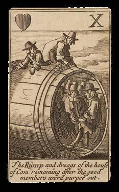 Following the execution of King Charles I and the purge of his supporters in 1649, the English Parliament was left with a reduced number of members, giving rise to its nickname the Rump Parliament, with rump in this case meaning a remnant or residual part. During the short-lived Commonwealth period, this Rump Parliament passed numerous acts limiting religious, legal, cultural and commercial practices in the name of “godliness”. These acts are satirised on Barlow’s cards, each of which is dedicated to a different element or scene of the Interregnum rule.