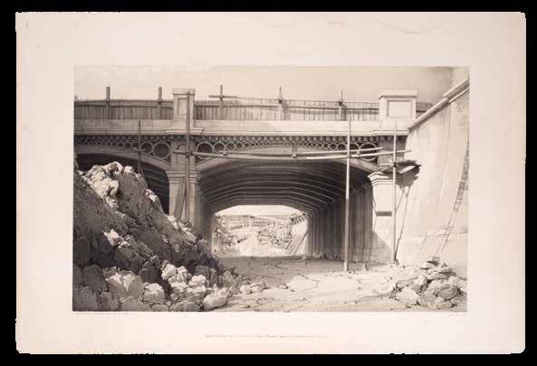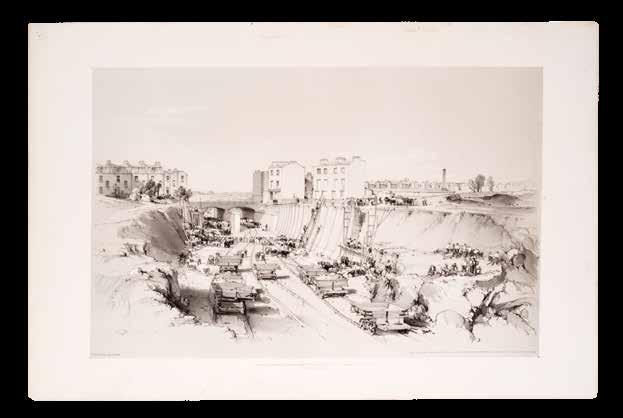 John Cooke Bourne’s lithographs were published in the first series of his ‘Drawings of the London and Birmingham Railway’ (1838-1839). They include images of: the Entrance Portico at Euston Grove Station, Hampstead Road Bridge, Building Retaining Wall &c. near Park Street, Railway Bridge over the Regent’s Canal, Building the Stationary Enginehouse at Camden Town, Locomotive-Engine House, Entrance to Locomotive Engine House, Primrose Hill Tunnel, Watford Embankment, Coldne Viaduct, Nash Mill Bridge, Oblique Bridge, Box-Moor Embankment, Berkhampstead Herts, Tring Cutting, Canal Bridge & Jackdaw-Hill, Blastings Rocks, Making the Embankment, Avon Viaduct, Blisworth Cutting, Weedon Viaduct, Pumps for draining the Wilsby Tunnel, View from above Kilsby Tunnel, Railway Bridge Rugby, Sherbourne Viaduct, Woolverton Viaduct, Viaduct over the River Blythe, and the Entrance to Birmingham Station. Without plates 1, 3, 4, 14, 28, 31, and 32.