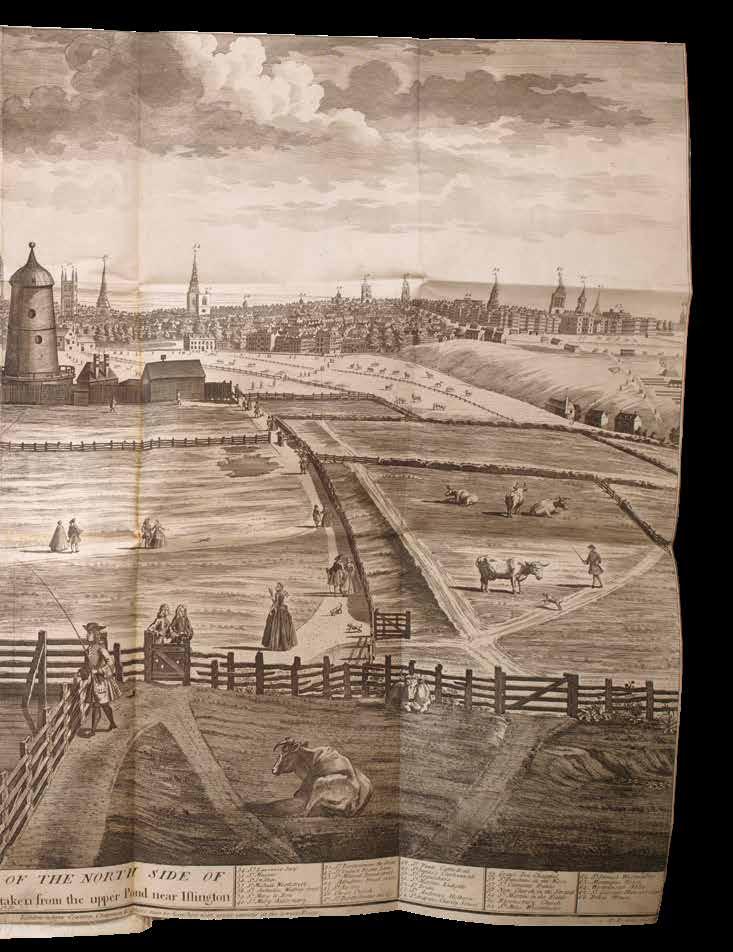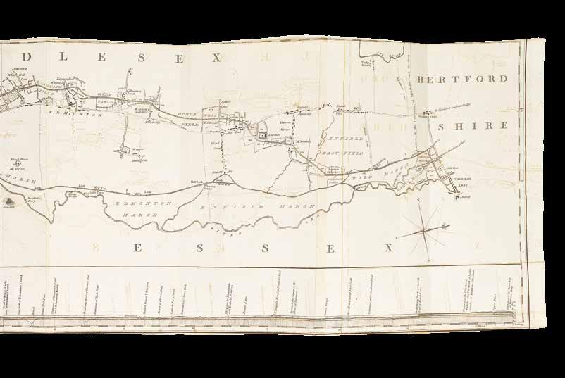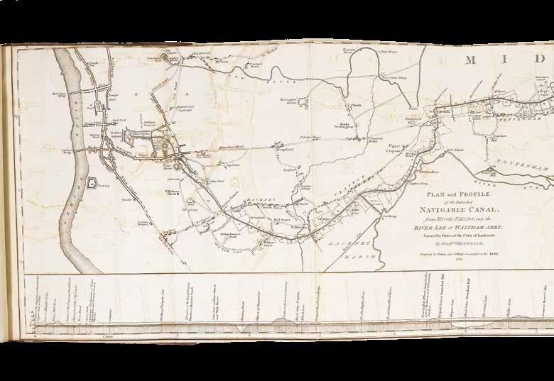 Whitworth’s plan never became a reality, although the Regent’s Canal built during the 1810s followed a similar route in part and succeeded in connecting North London with the main canal to Birmingham. Whitworth’s report was accompanied by a forceful letter by James Sharp of the Common Council, urging support for the canal in order to maintain London’s position in world trade. It also contained a map outlining the proposed canal: ‘Plan and Profile of the Navigable Canal from MoorFields into the river Lee,... surveyed ... by Robert Whitford...’ (1773). London’s main roads are outlined and identified, as well as some significant buildings such as the “British Museum”, “Bethlem Hospital” and “Foundling Hospital”. Whitworth represents his proposed canal with a thick dark line running from Paddington to the north of St Pancras and into the City. Along the lower edge is a cross-section showing the depth of the river along the planned route.
