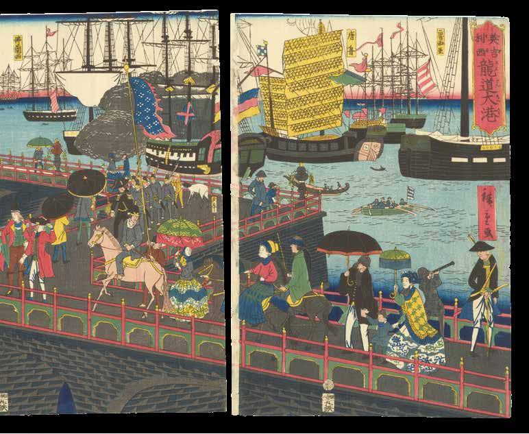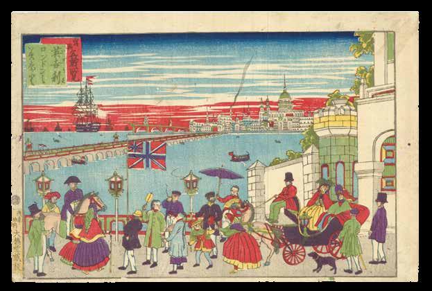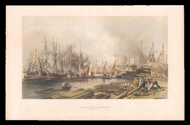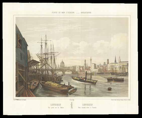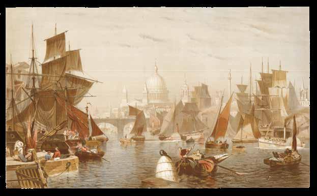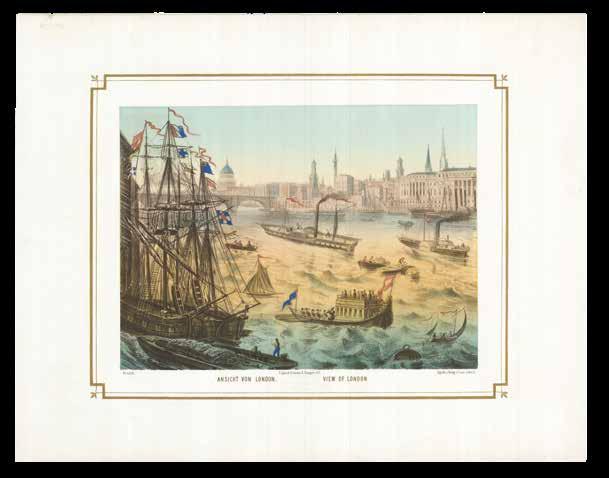 The present print shows the stretch of the Thames between London Bridge and Limehouse known as the “Pool of London”. Here it is packed with sailing, steam, and rowing boats, with a narrow passage through the various vessels at the centre. On either side, London’s majestic buildings rise into the sky.