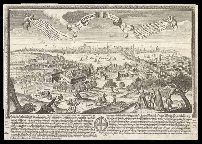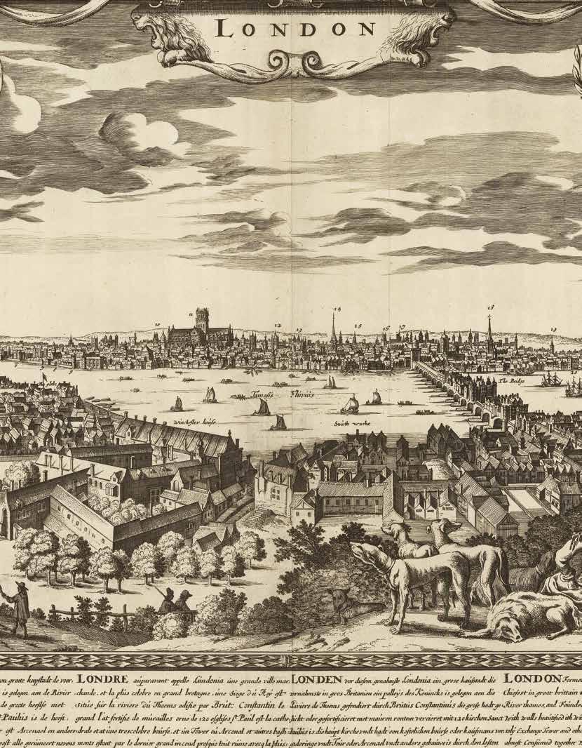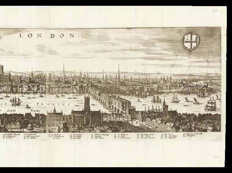 Thus the early history of printing in London is limited to a rather small number of printers, engravers, and draughtsmen who nonetheless made a great impact on the depiction and (self-)perception of the city. Among these was Wenceslaus Hollar, a Czech artist who lived in the city almost consistently from 1637 until his death in 1677. Hollar’s prospects, landscapes, and scenes of London provide an indispensable source of information about the history, topography, architecture, and culture of the capital during the seventeenth century. In particular, his prospect of London (items 11-13) offers an unparalleled view of the city as it stood before it was devastated by the Great Fire of 1666.