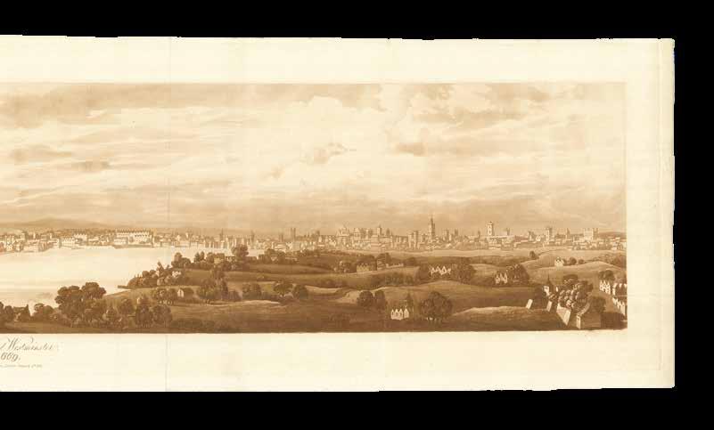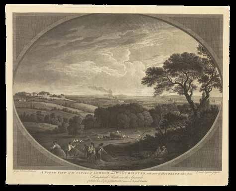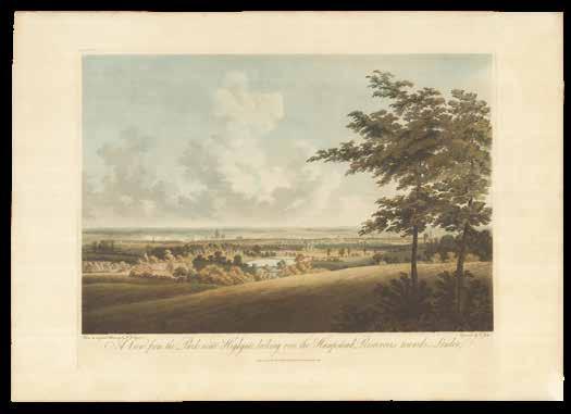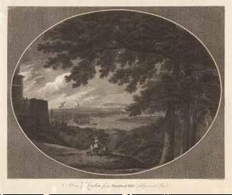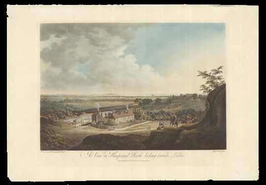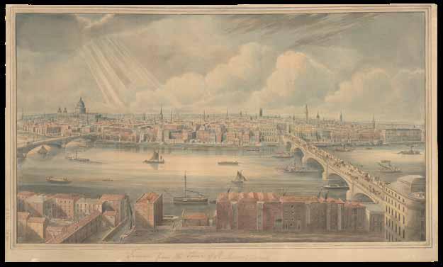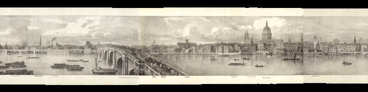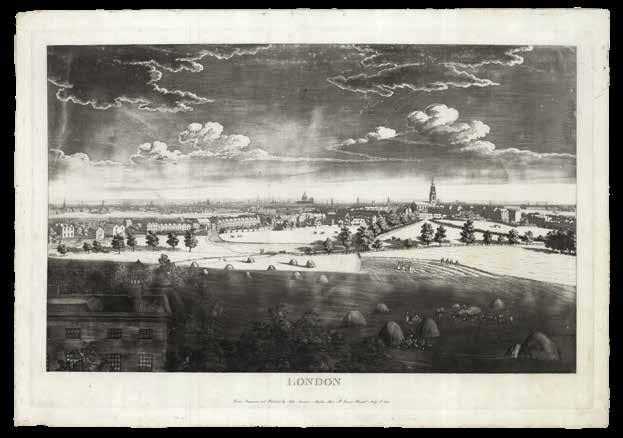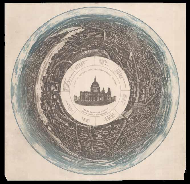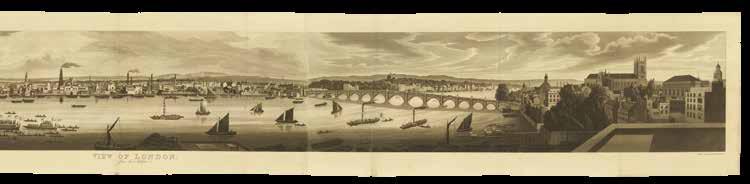 Although the urban vista had already been captured in a vast range of prints, it was not until the end of the eighteenth century that the first true panorama of London was made. Depicting the city from the southern end of Blackfriar’s Bridge, Barker’s original painting spanned a canvas of almost 1500 square feet and was taken on a tour of Europe. Simultaneously, printmaker Frederick Birnie produced “six elegant aquatint prints, which, if joined, will represent the City of London and the entire surrounding country as seen from the top of the Albion Mill” (item 63), thereby giving the public access to an original new form of art.