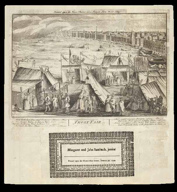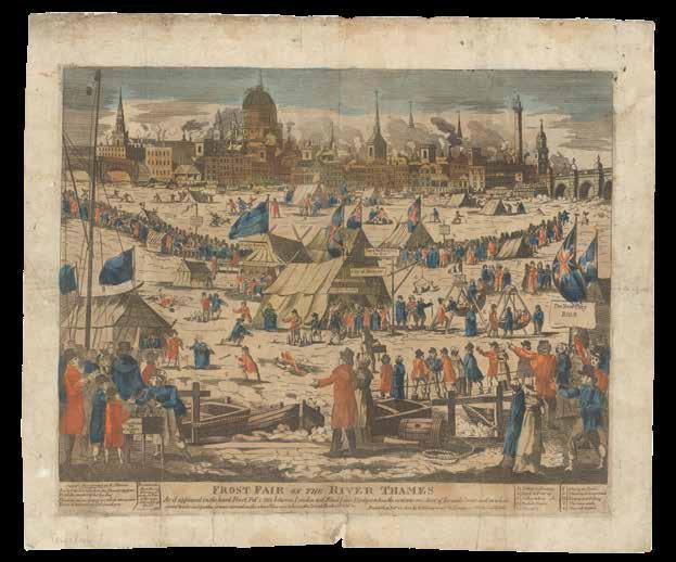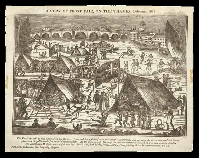 such as the 1751 iteration of Westminster Bridge (items 160-164), often encouraged the city’s publishers to produce commemorative prints of the structure, and likewise important events were almost inevitably accompanied by a wave of celebratory prints, some even produced at the event itself, as was the case with the Frost Fair of 1814 (items 211-213). Scenes such as William Hogarth’s series showing the capital’s streets at various times of the day (item 448),, Edwin Edward’s collection of inns (item 453), and Benjamin Read’s advertisements for his new sartorial collections (items 411-414) also shed light on day-to-day life for London’s inhabitants, both at work and play.