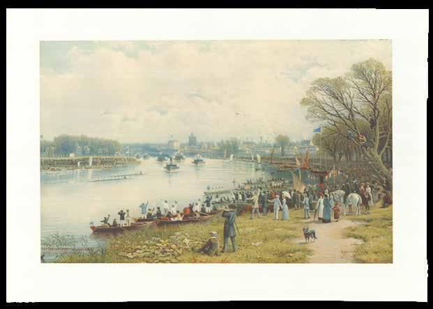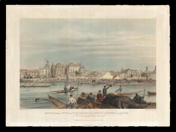 This plate depicts a race between the boat clubs of Westminster School (in pink, lagging behind on the left of the plate) and Eton College (in blue, lengths ahead) on the river at Putney. The race took place annually from 1829 to 2004.