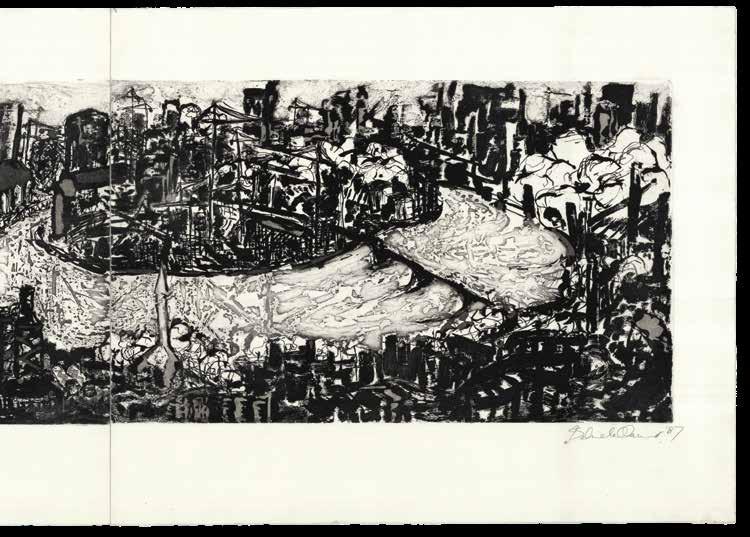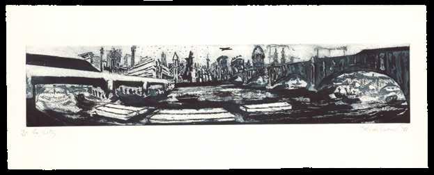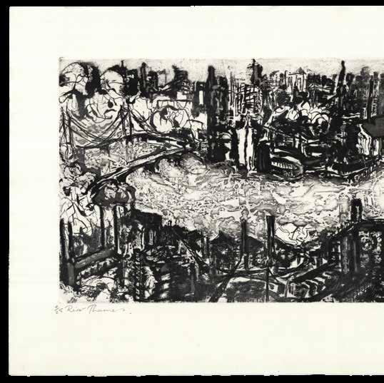 Limited edition, number four out of 25 examples, dated 1987 and signed by the artist. Belinda Channer (b1961) is a contemporary British artist. This black and white etching presents the Thames with its banks and bridges, as well as the steeples, factories, and numerous buildings of the City beyond.