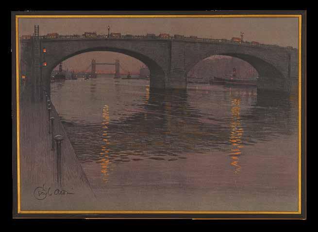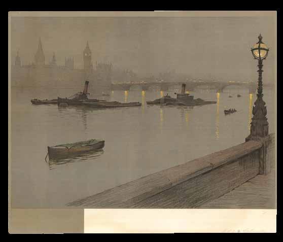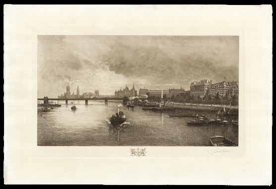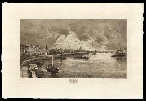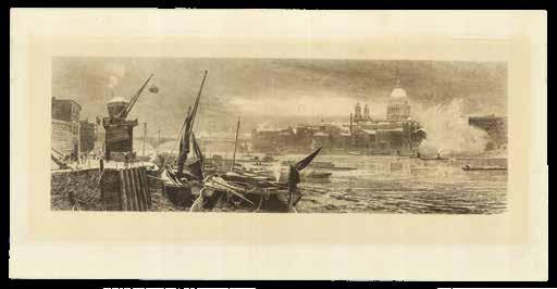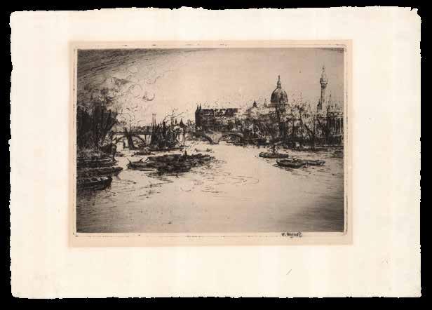 A view from the Thames at Rotherithe, looking upstream towards London Bridge, the Monument, St Paul’s Cathedral, and Cannon Street station. William Monk (1863-1937) was a British etcher and engraver. Having trained first at Albion House, in his native Chester, then at the Royal Academy, Antwerp, he would become one of the leading practitioners of architectural engraving of the late-nineteenth and early-twentieth centuries, and a prominent figure in the British Etching Revival. He is perhaps best known for the ‘Calendarium Londinense’, often referred to as “Monk’s Calendar”, that he produced each year.