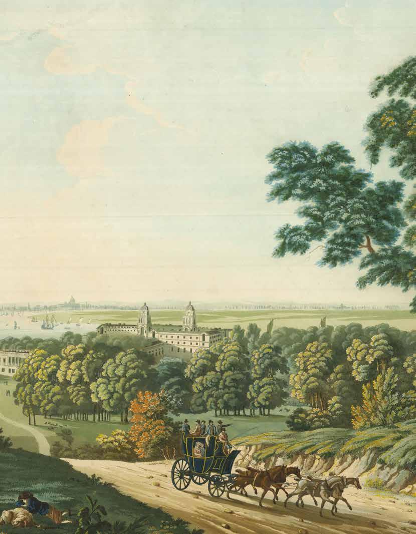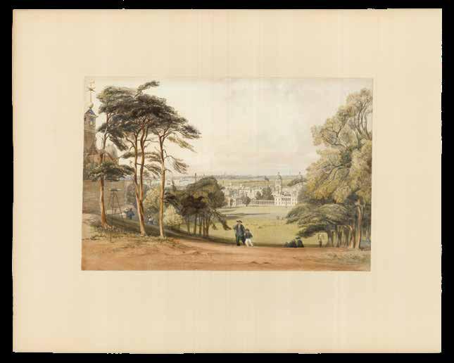 The present print shows the impressive façade of Greenwich Hospital, designed by Sir Christopher Wren, as seen from the Isle of Dogs. In 1873, the buildings of the Hospital were repurposed as the Royal Naval College, a training establishment for the Royal Navy, which it would remain until 1998. Here, numerous ships appear on the waters of the Thames, with clouds and birds gathering overhead.