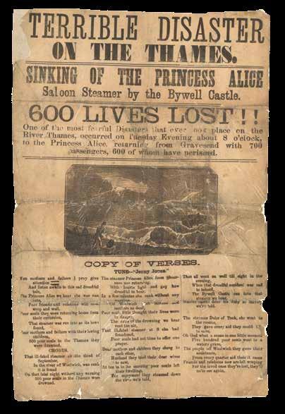 On 3rd September 1878, SS ‘Princess Alice’, a passenger paddle-steamer, which was carrying hundreds of passengers back to London after a day on the Kent coast, collided with the collier ‘Bywell Castle’ and sank, leaving between 600 and 700 people dead. The present print memorializes the tragedy.
